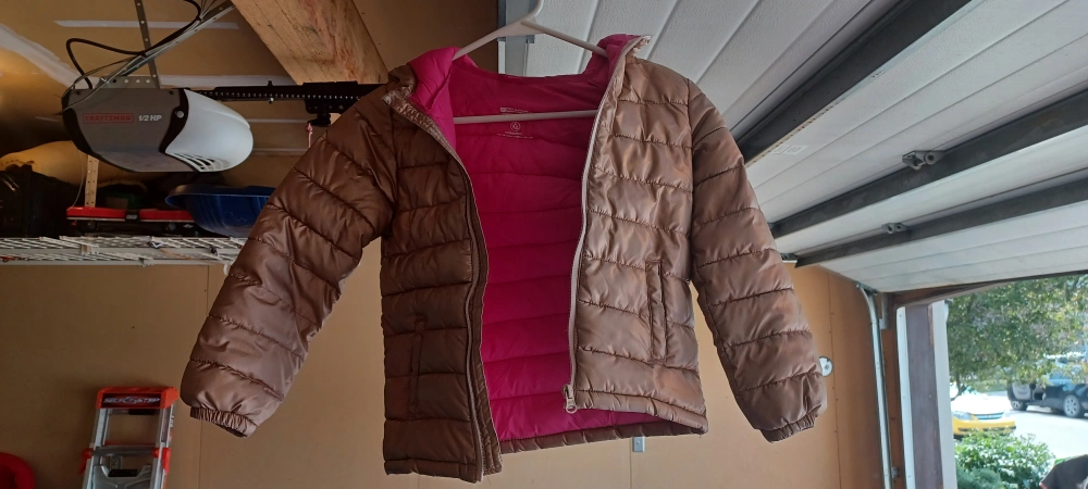 Gold puffer jacket. Features a bright pink interior. The jacket has a zipper closure. Consider it a great option to keep warm on cool evenings.