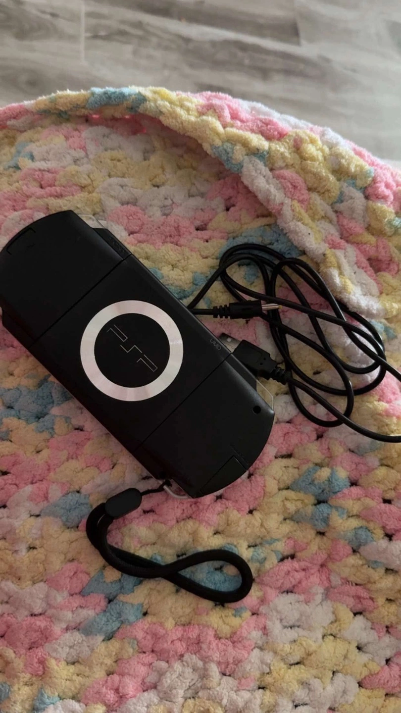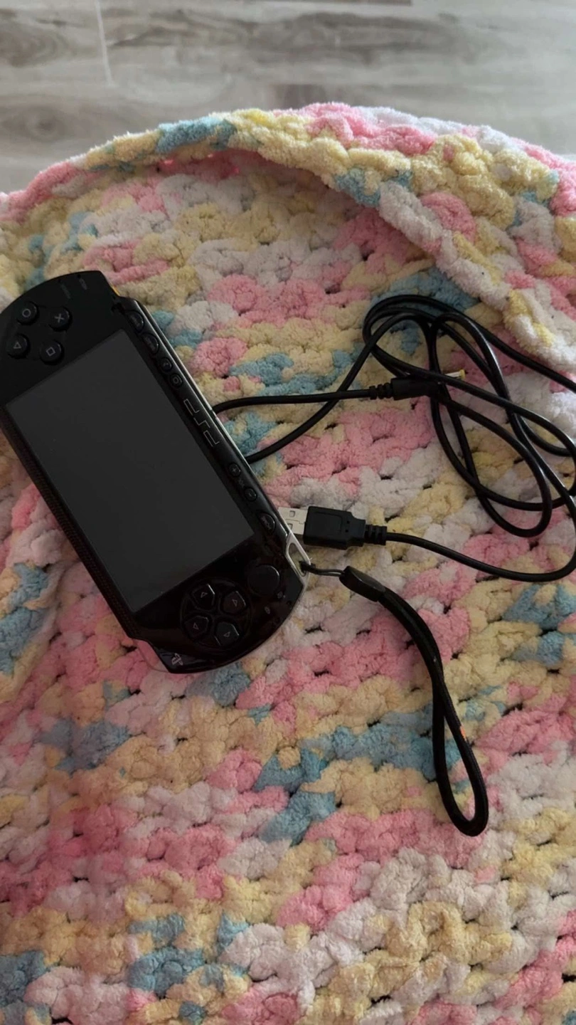 A black handheld console. Includes a charger. A great item for enjoying relaxing gaming sessions.