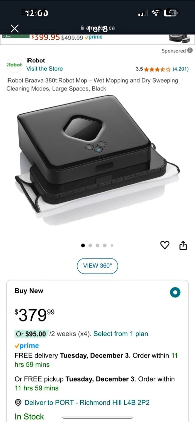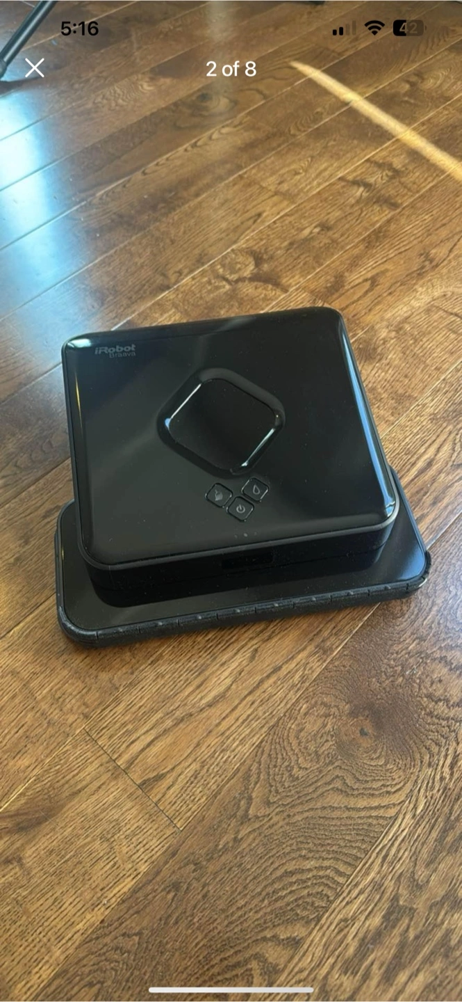 Robot mop in great condition. The black colour is clean. It has a top with buttons and a rectangular base. Enjoy cleaner floors with ease.