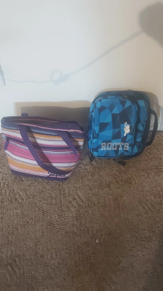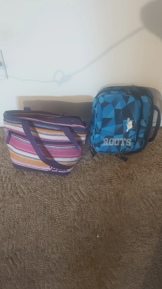 Includes two bags. One bag with a striped design and purple straps.-Thirty One. The other is a blue bag with a geometric design Roots bag. Perfect for packing a relaxing picnic and very good condition. Selling $5.00 each or both for $10.00