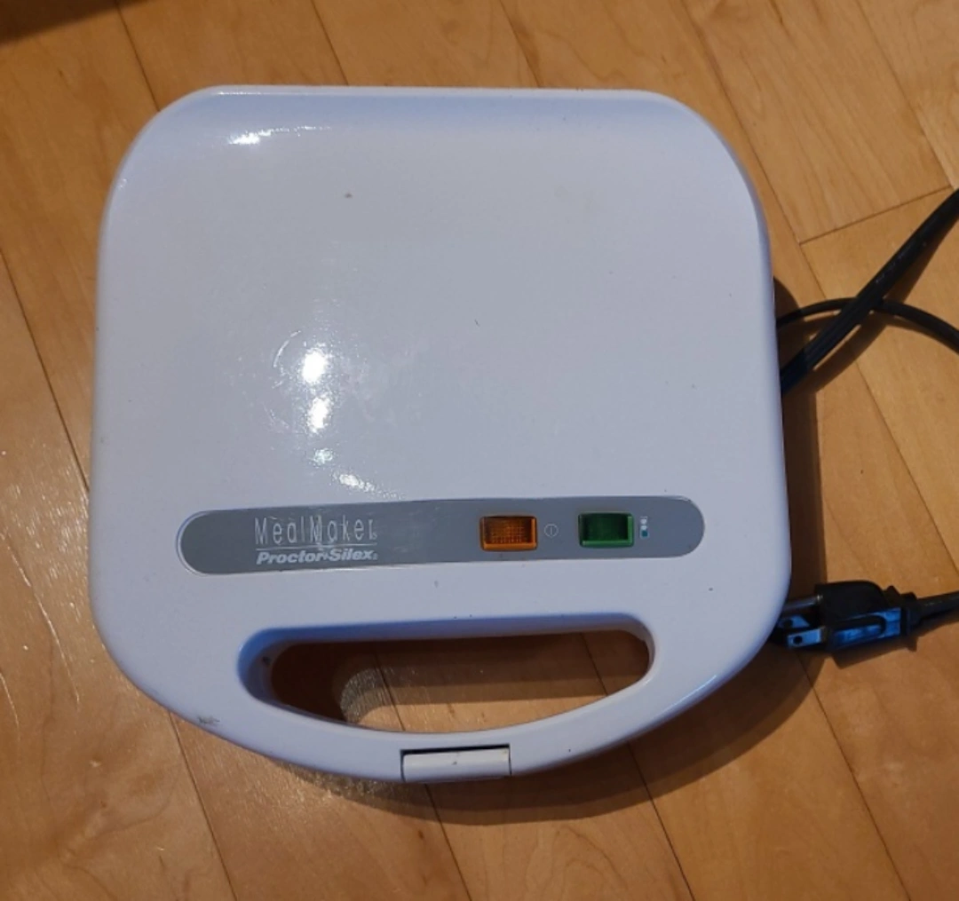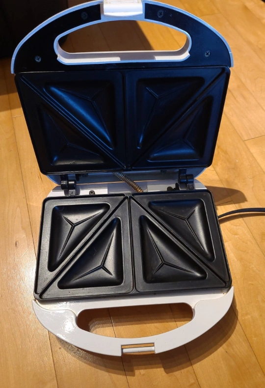 White sandwich maker with black cooking plates in good condition. A convenient handle on top. The unit features a power and ready light. Perfect for a quick and satisfying meal. Only available for pick-up in North York.