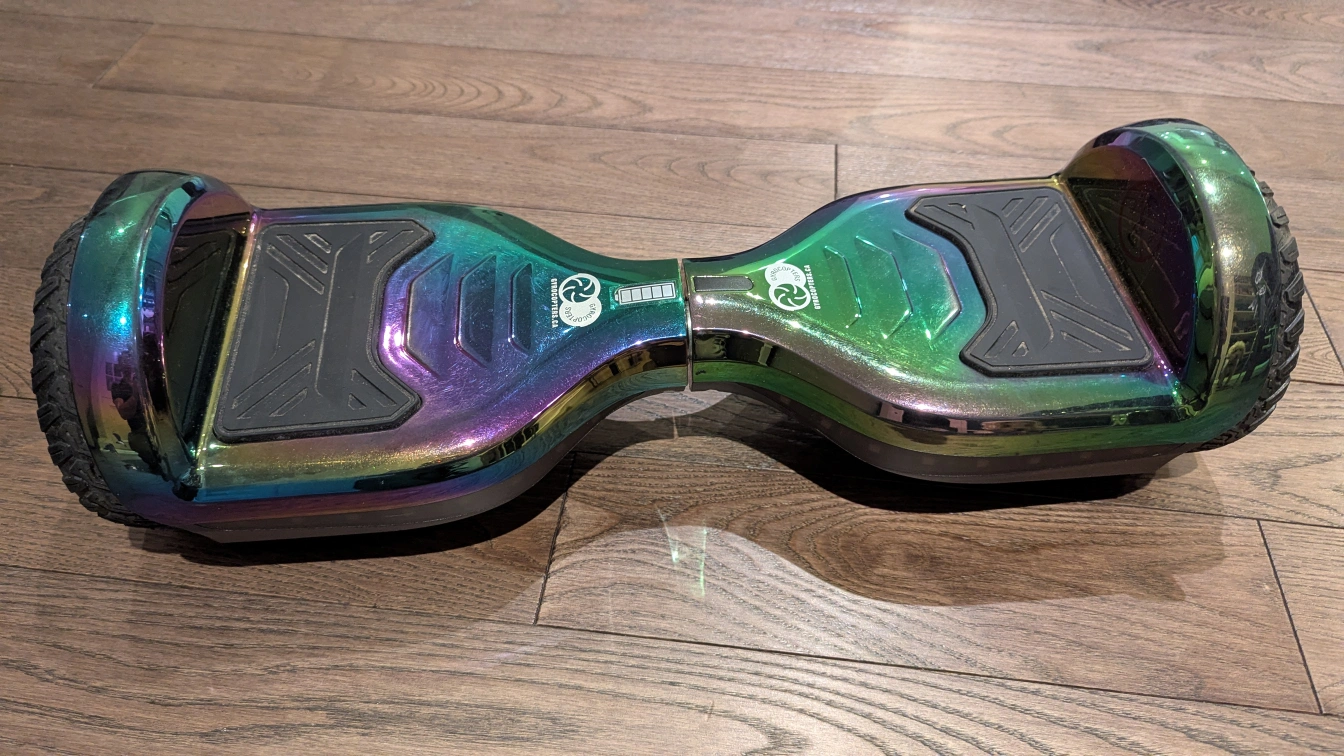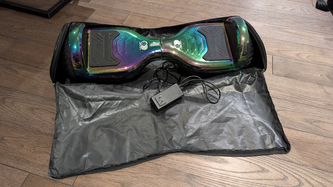 Gyrocopters iridescent hoverboard. It comes with a carrying bag and a charger. Gently used.