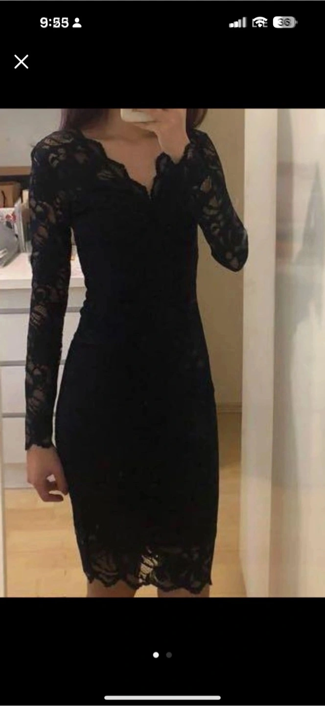 A form-fitting black dress. It features long sleeves with a lace design. Great for a night out. It would be a perfect addition to your wardrobe for your next special occasion.