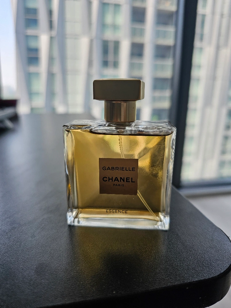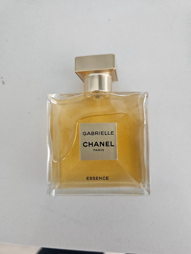 A clear, square perfume bottle. Features a gold cap, and a golden-toned perfume. In the center, a rectangular label. Can be a lovely addition to your morning routine. I used only few times.