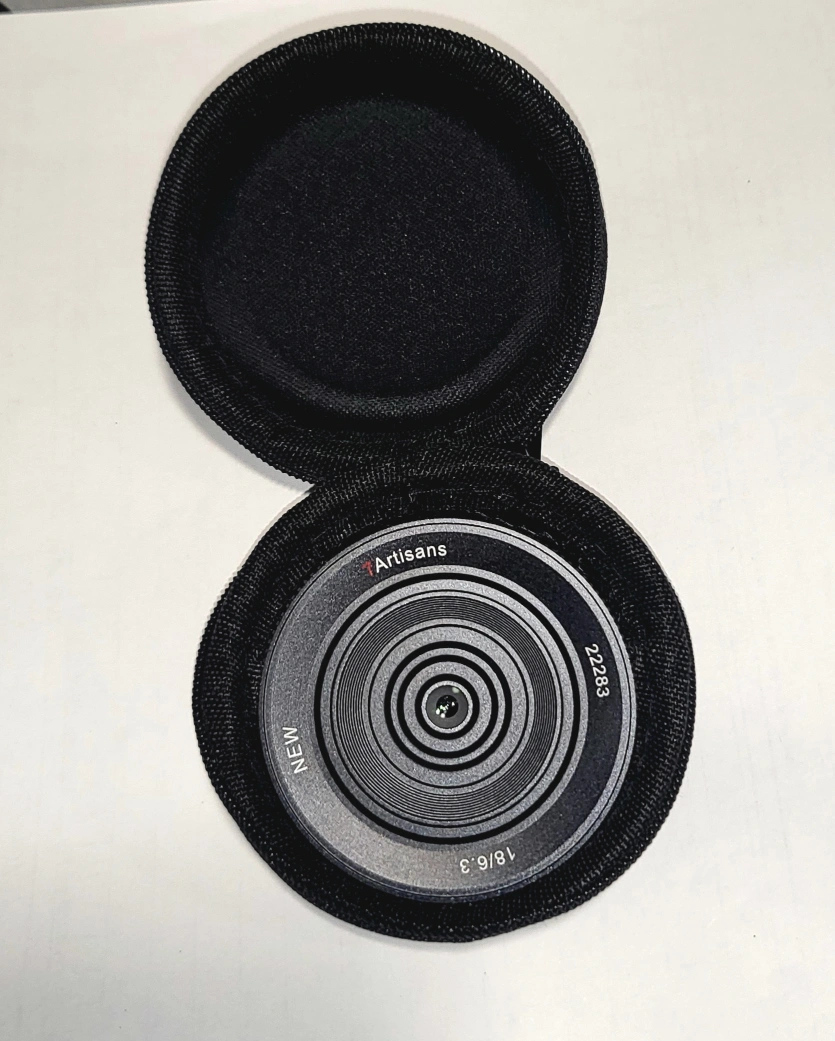 A lens, with a black protective case. The lens is circular, with concentric rings and a central lens. It comes in a round, zippered case. Consider using this item to expand your photographic horizons and calm your mind. 18mm f6.3 Fuji FX-mount with clam shell hard pouch.