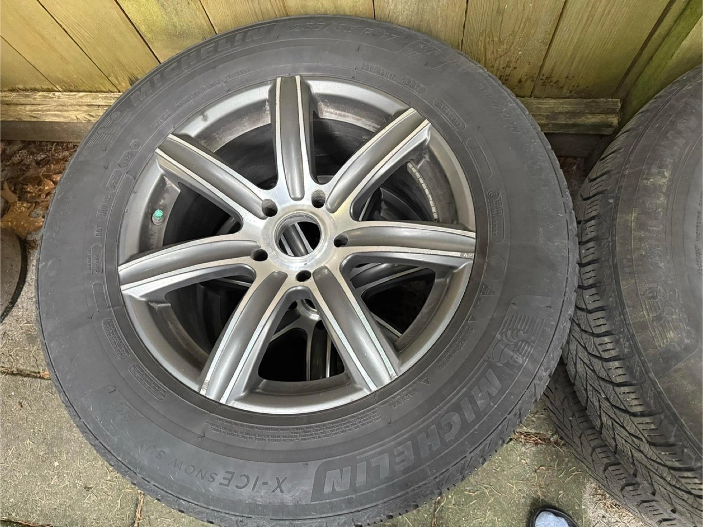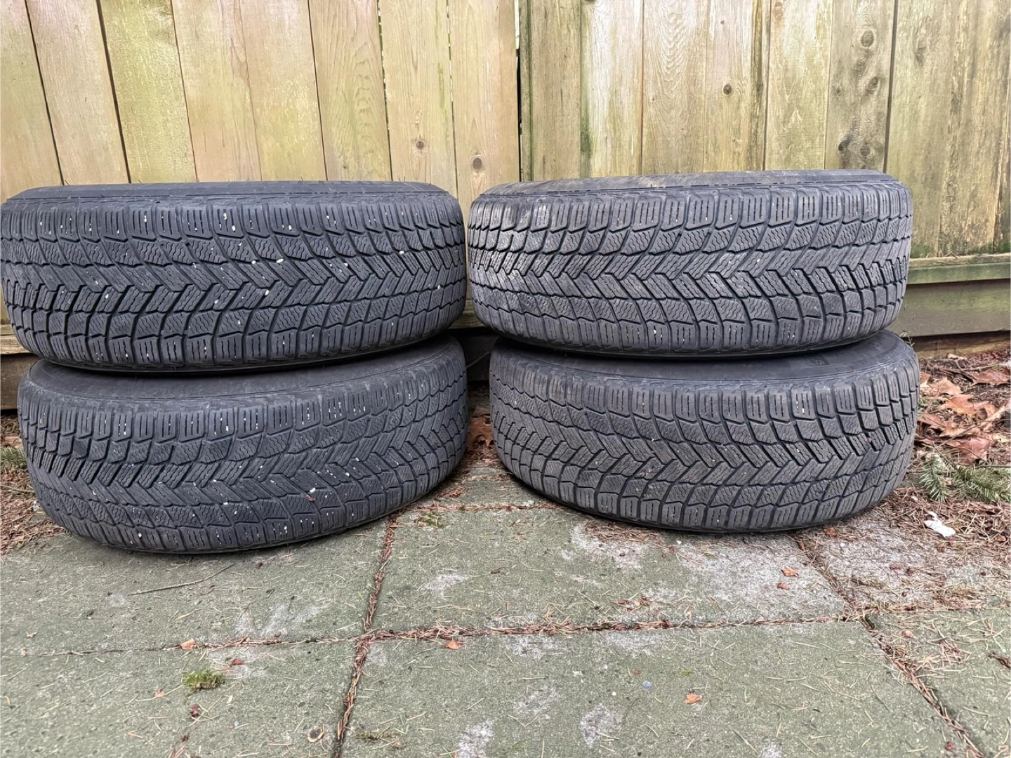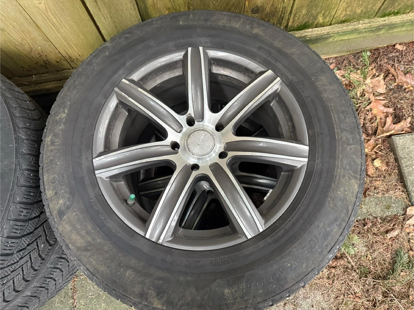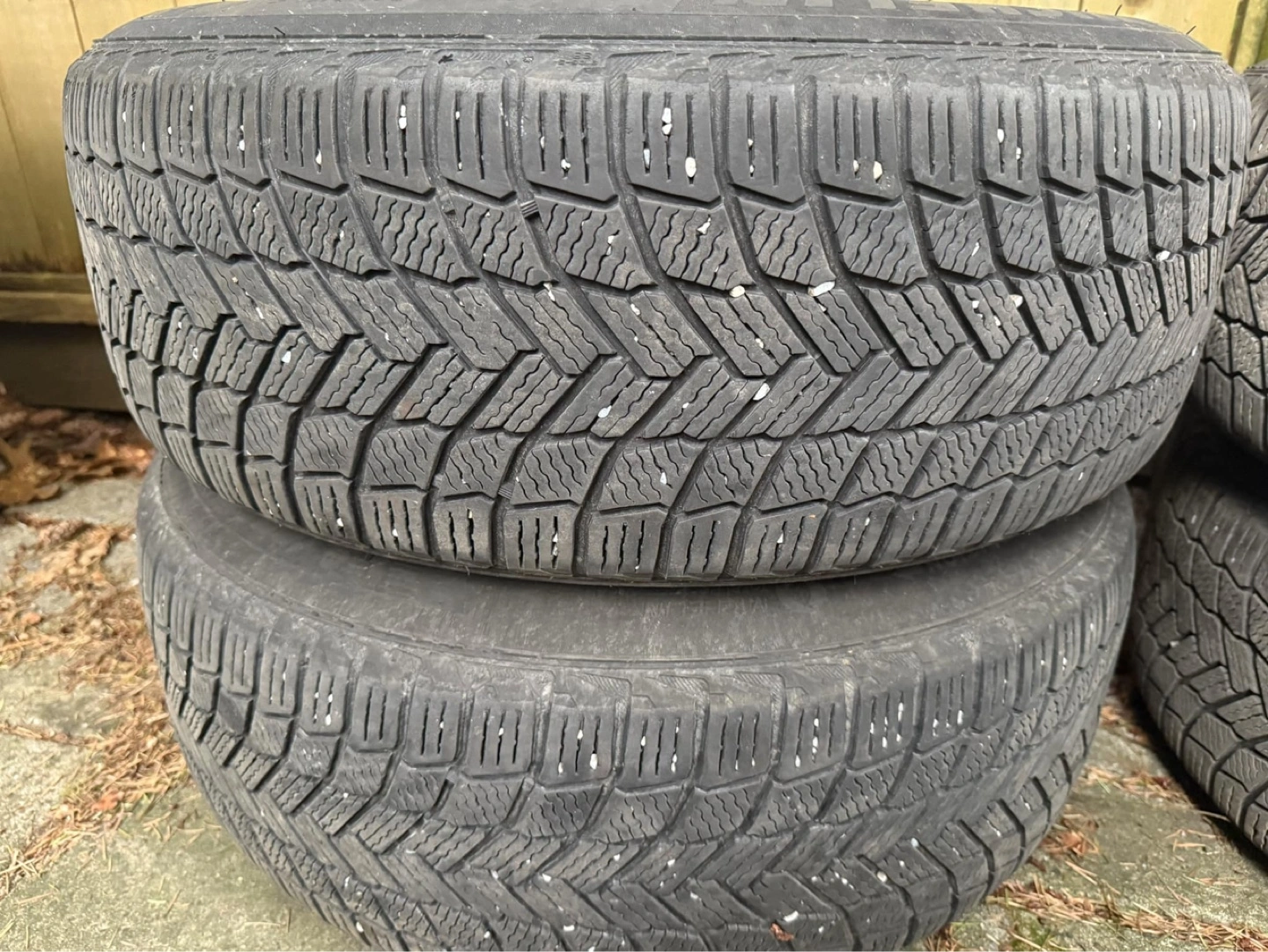 Here is a set of tires mounted on rims. The tires appear to be in good condition. Winter tires with a distinct tread pattern. The rims have a multi-spoke design. Driving safely in winter is easy when you have these. Enough 4 sensor Used 80%