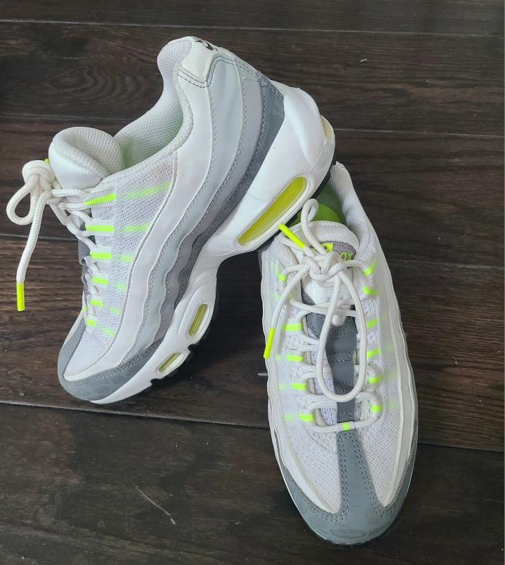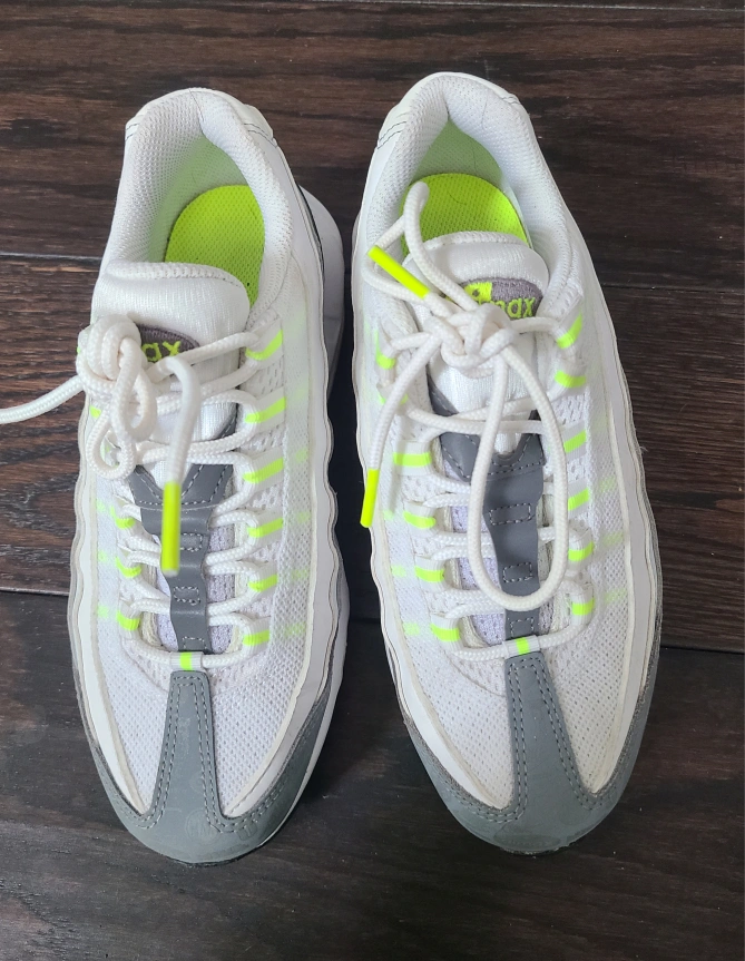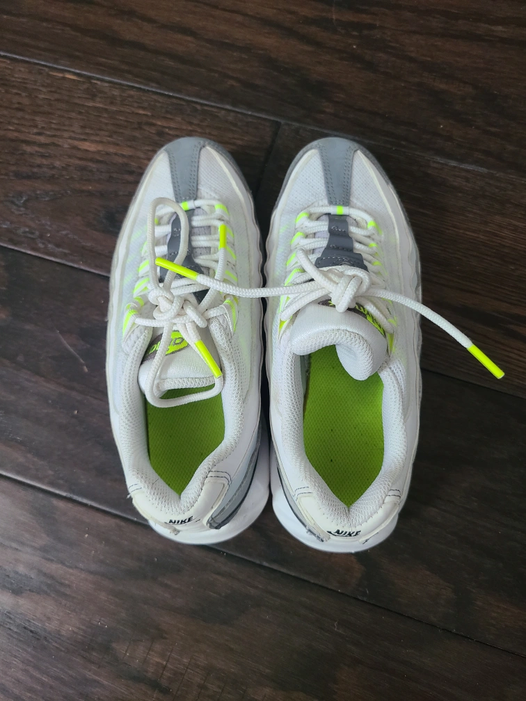 like new nike air max 95 sneakers im 4.5Y size. White sneakers with neon accents and grey detailing. Lace-up closure with white laces. retails $148+