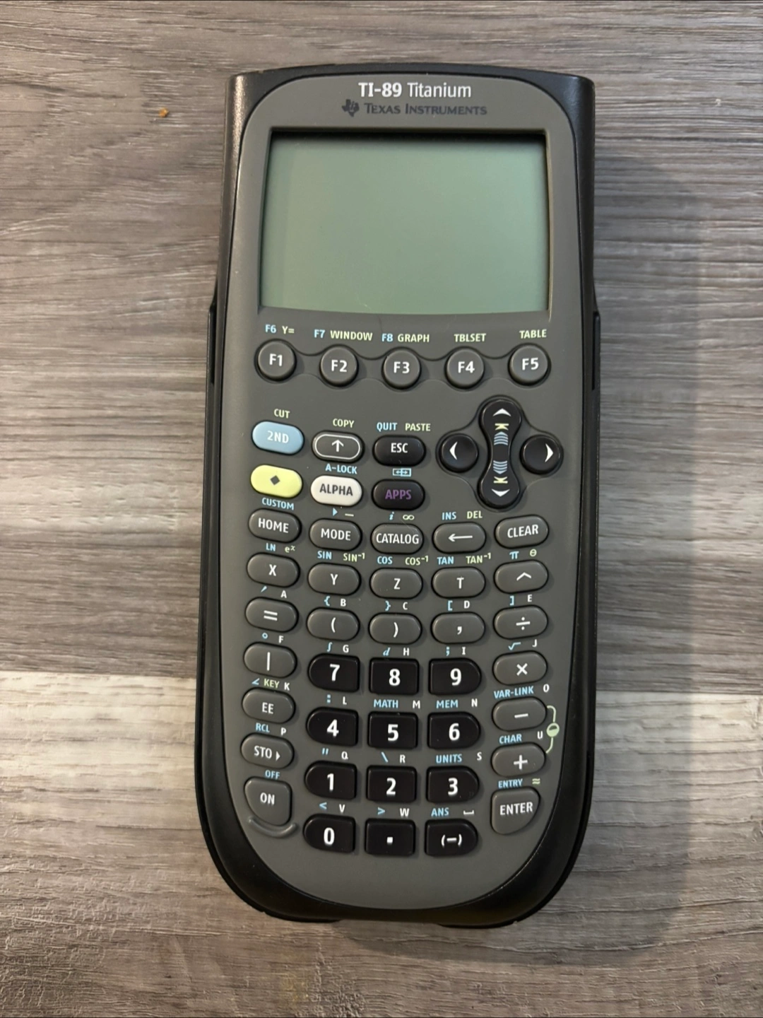A gray and black calculator with various buttons. Features a screen to display equations. A useful tool for solving complex problems. Using this item can bring peace to a hectic school day.