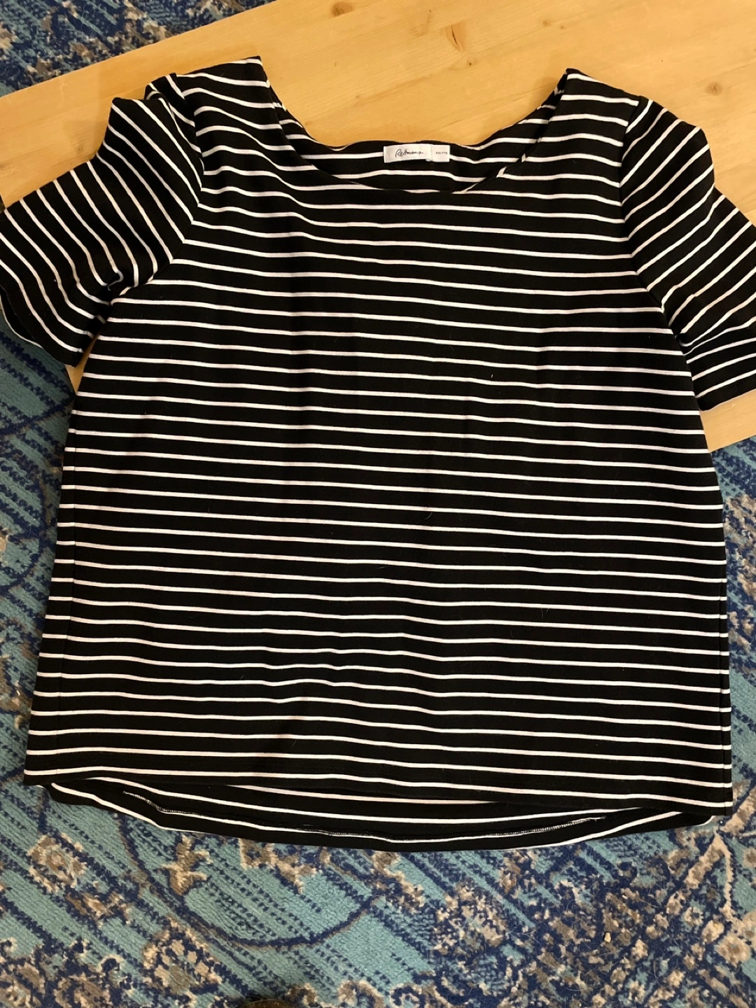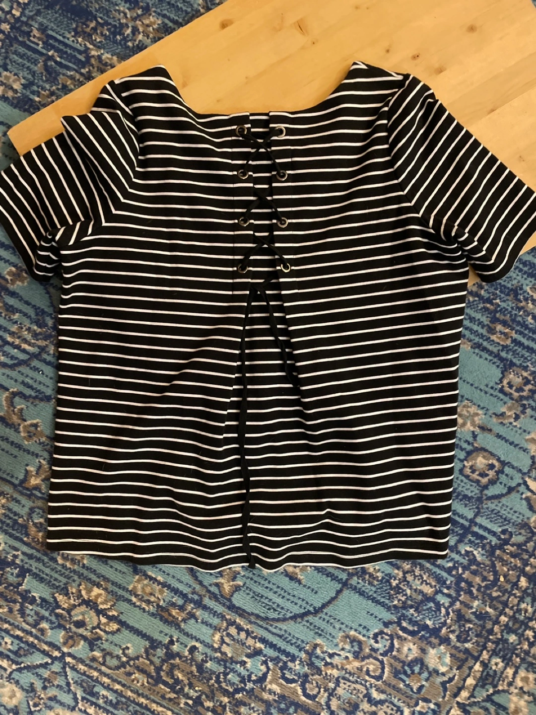 Black and white striped tee. Short sleeves. Features a unique lace-up detail in the back. A simple tee like this would be perfect for lazy days at home.