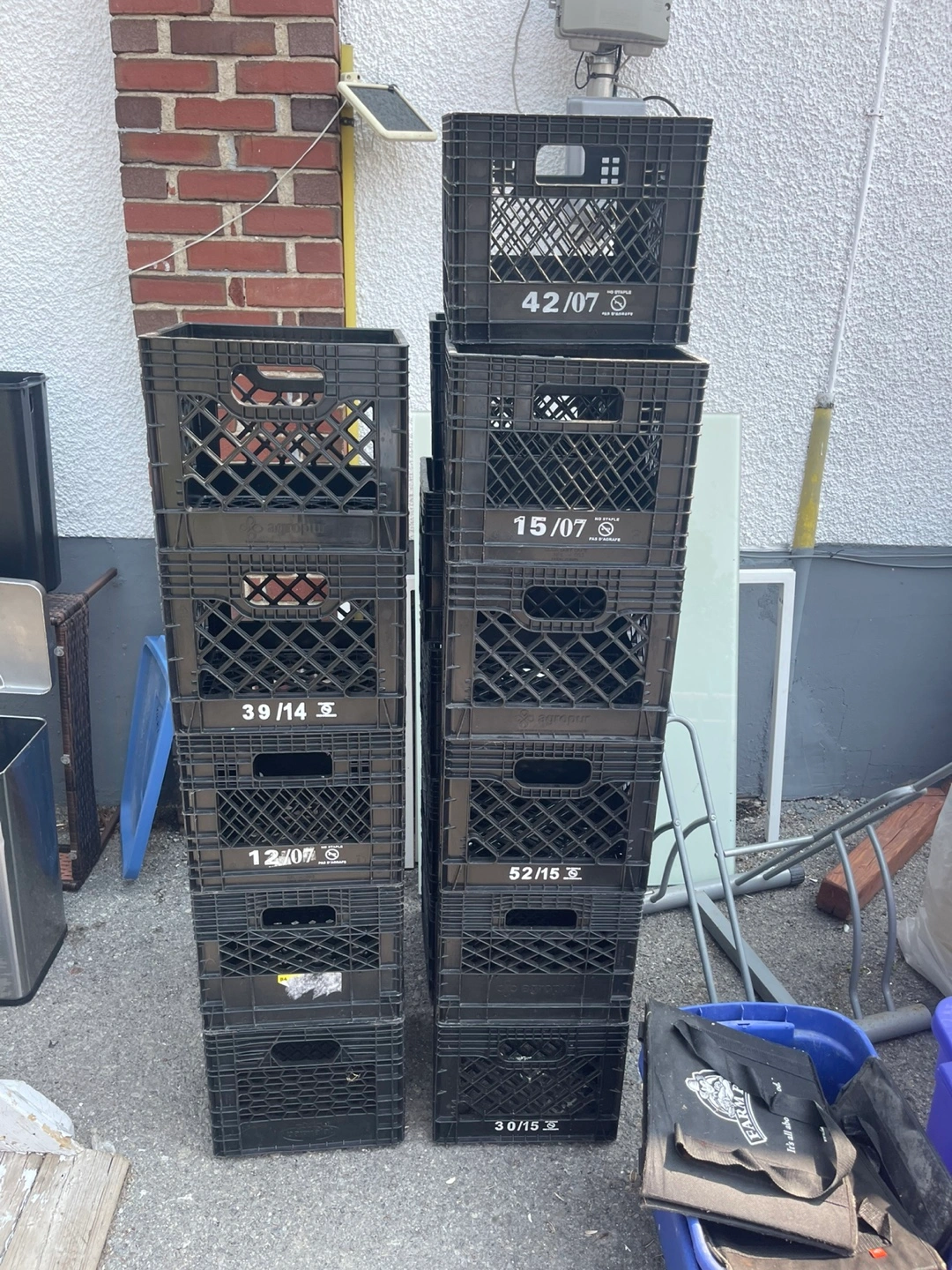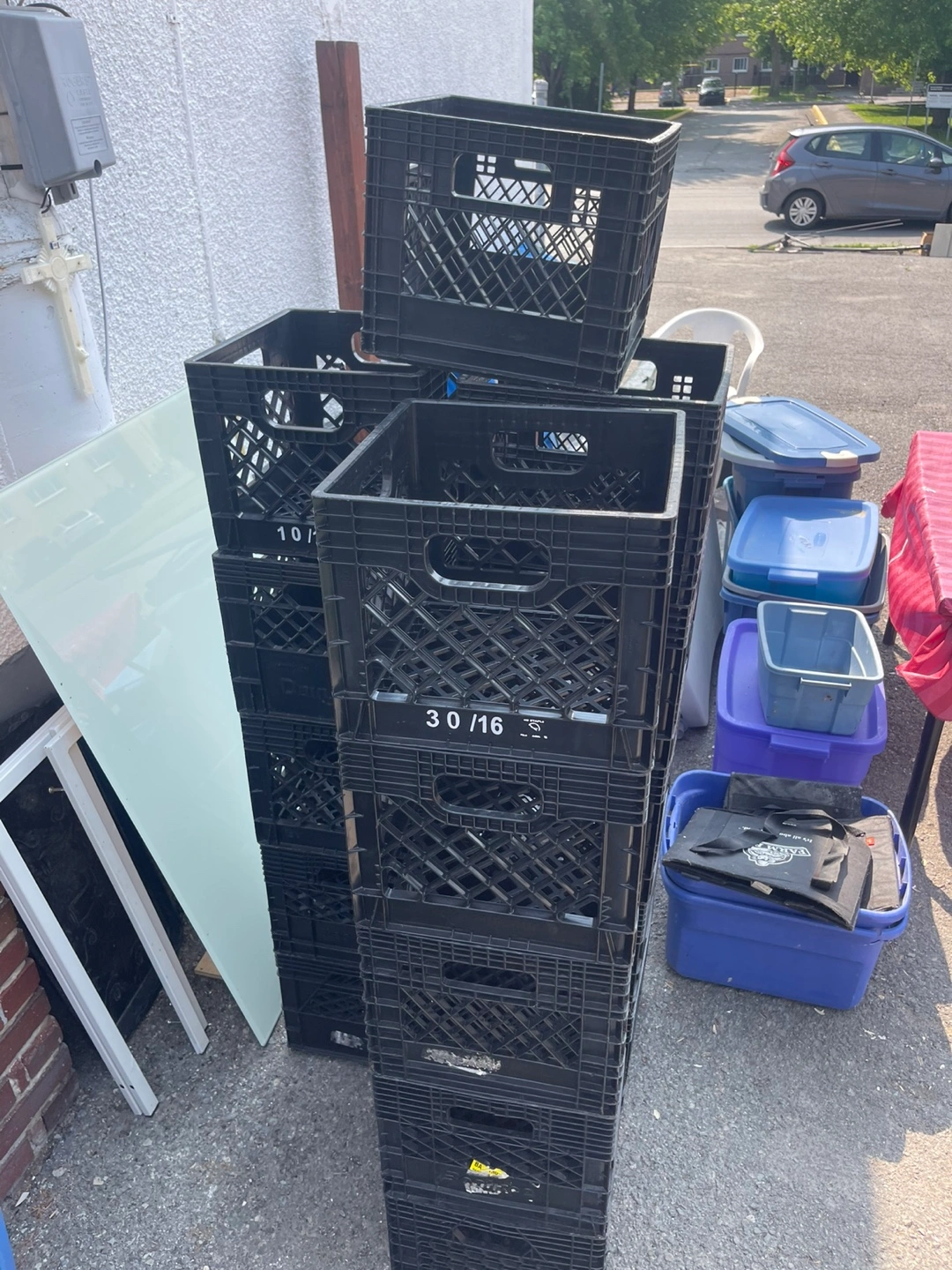 Stack of black plastic crates. Crates appear to be in good condition. These crates offer an easy way to organize and store your belongings.
