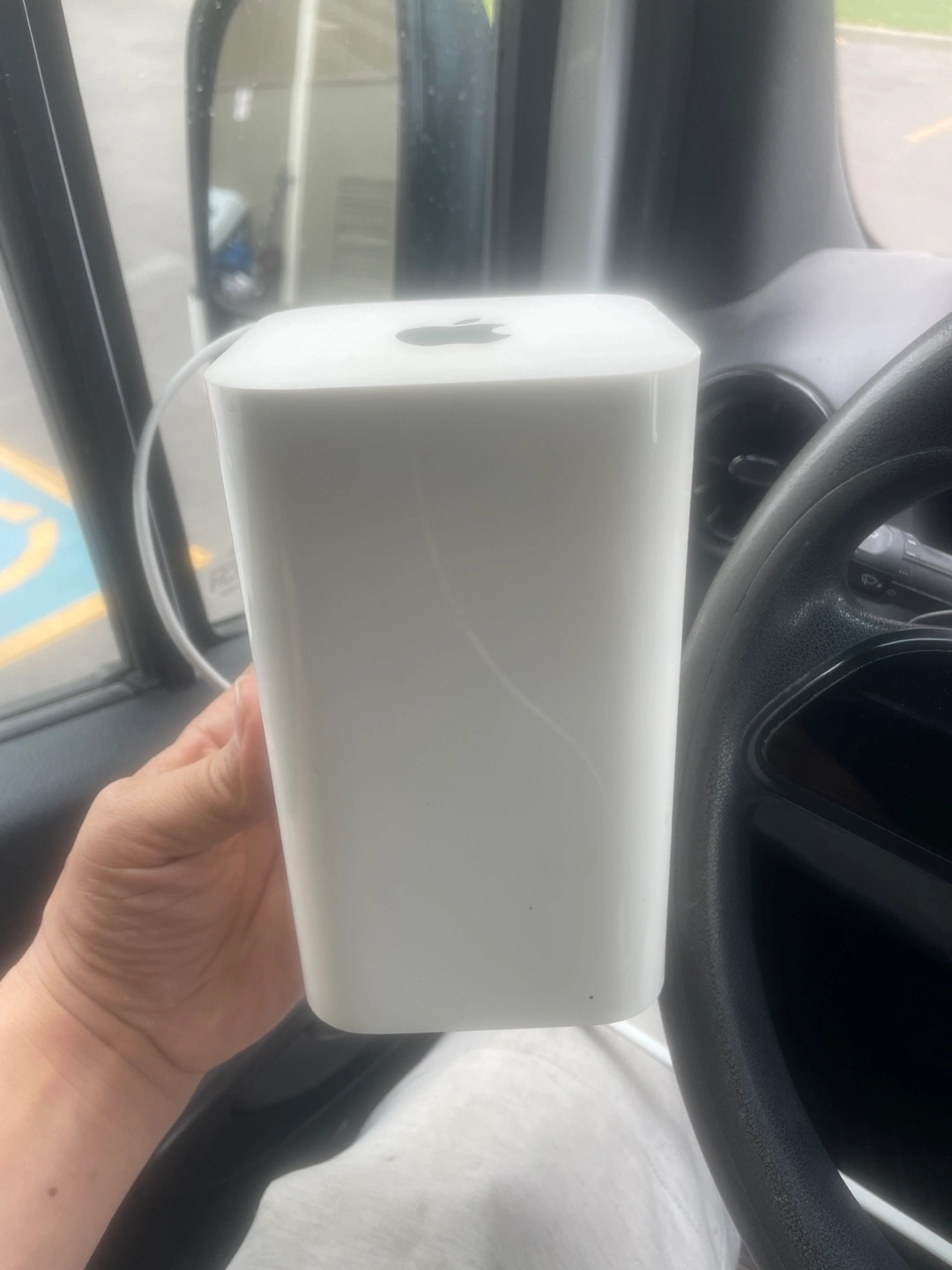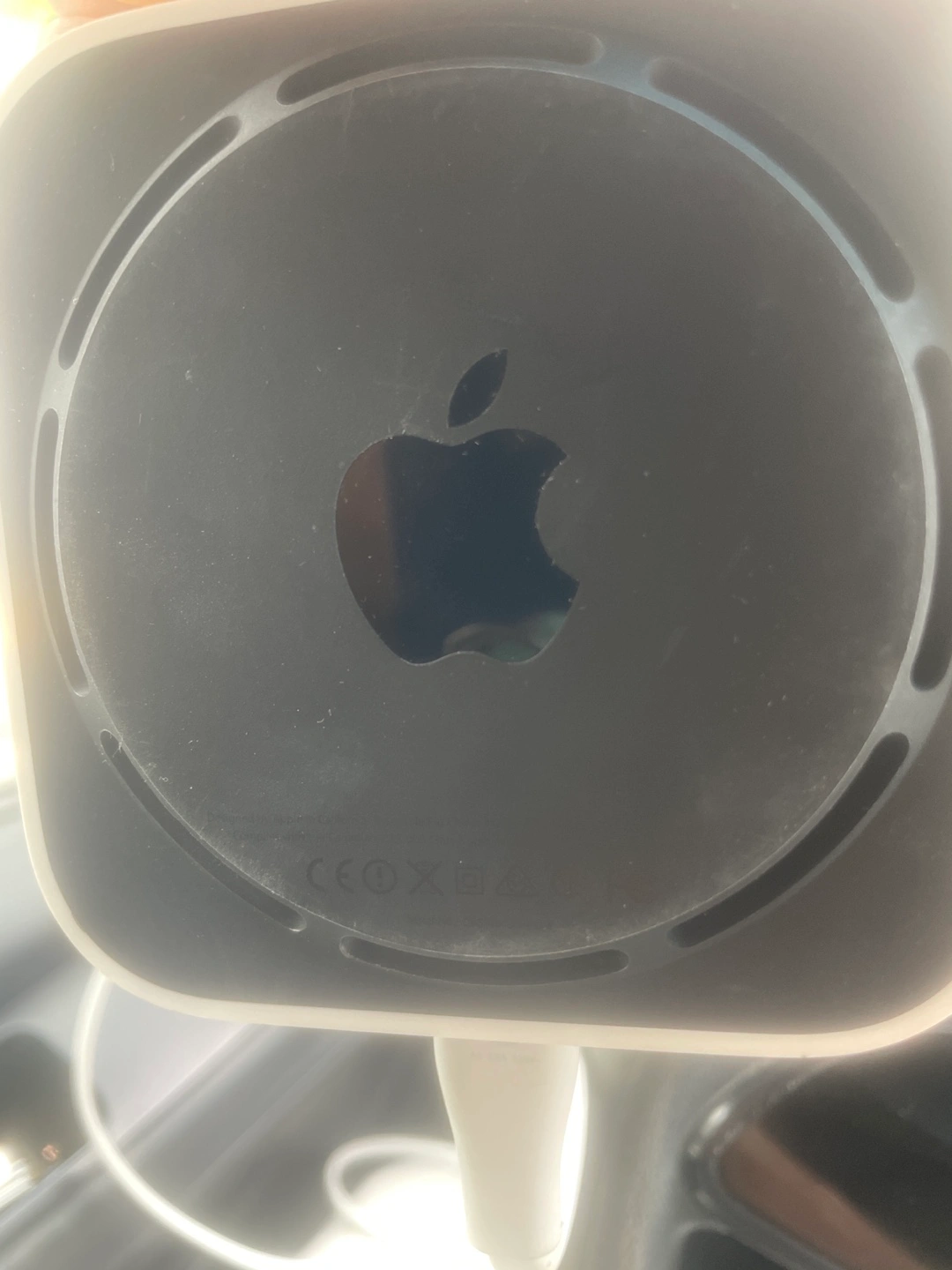 White, sleek design. With the Apple logo on the top, and a few indicator lights. Features several ports on the back. Setting it up in your home will help you feel at peace, and allow for seamless connectivity.