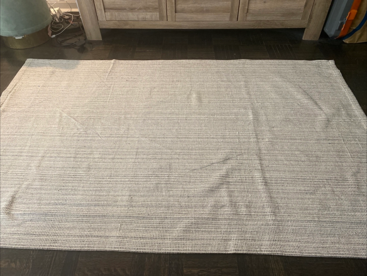 A rectangular rug. The rug is a light neutral colour. It has a woven texture. The rug would look great in a meditation space, helping you to relax. Barely used. Was in the storage most of the time