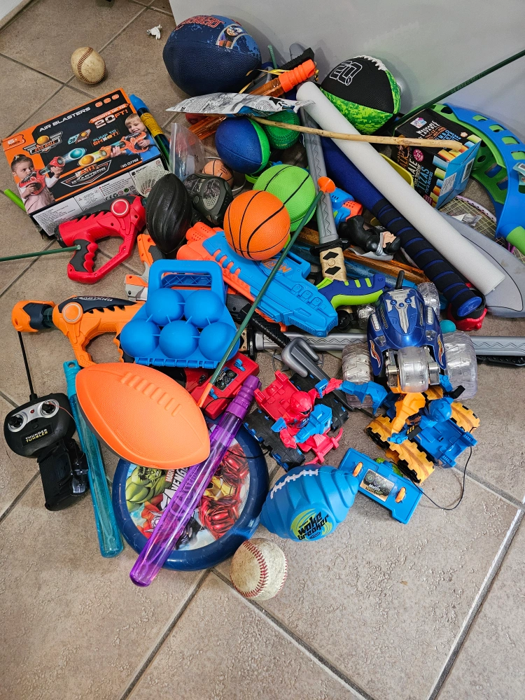 A selection of toys. Includes a variety of balls, toy guns, and toy vehicles. There are also some bubble wands, and other fun items. A great way to create some joy and happiness.