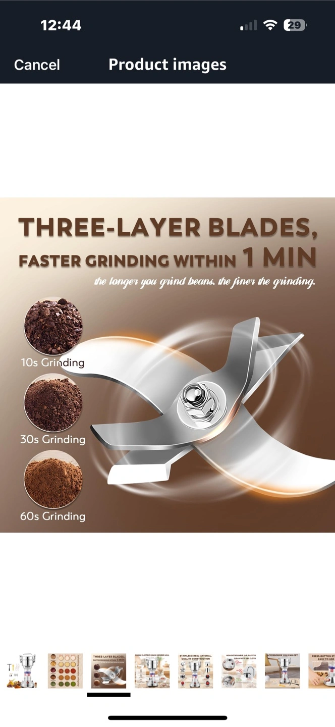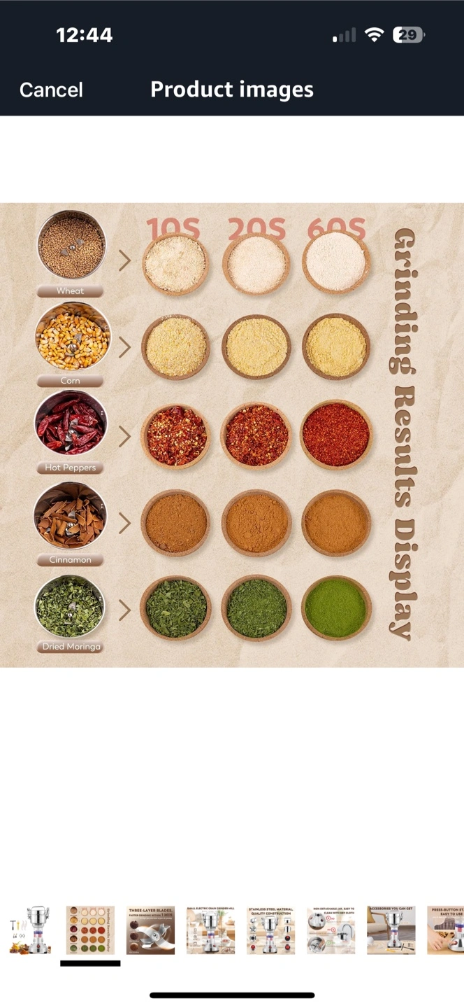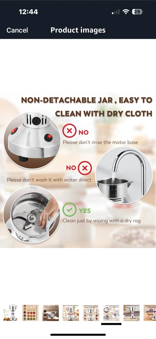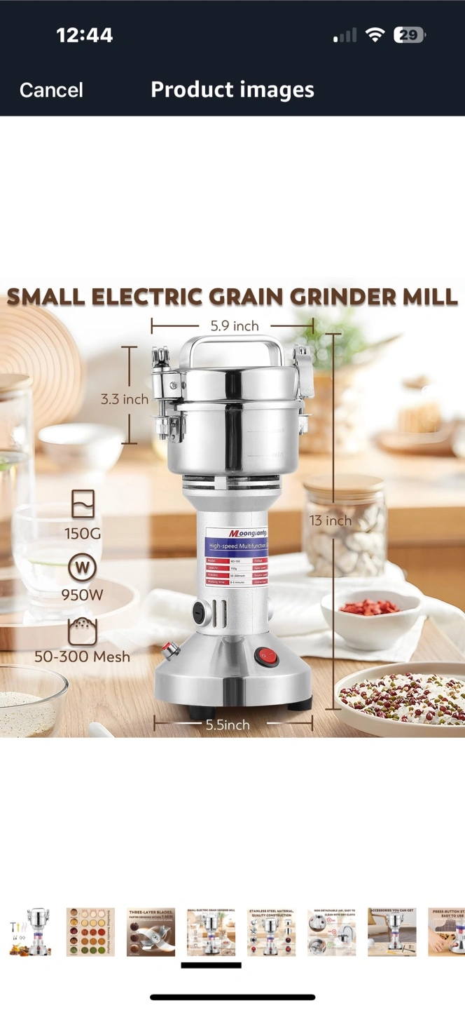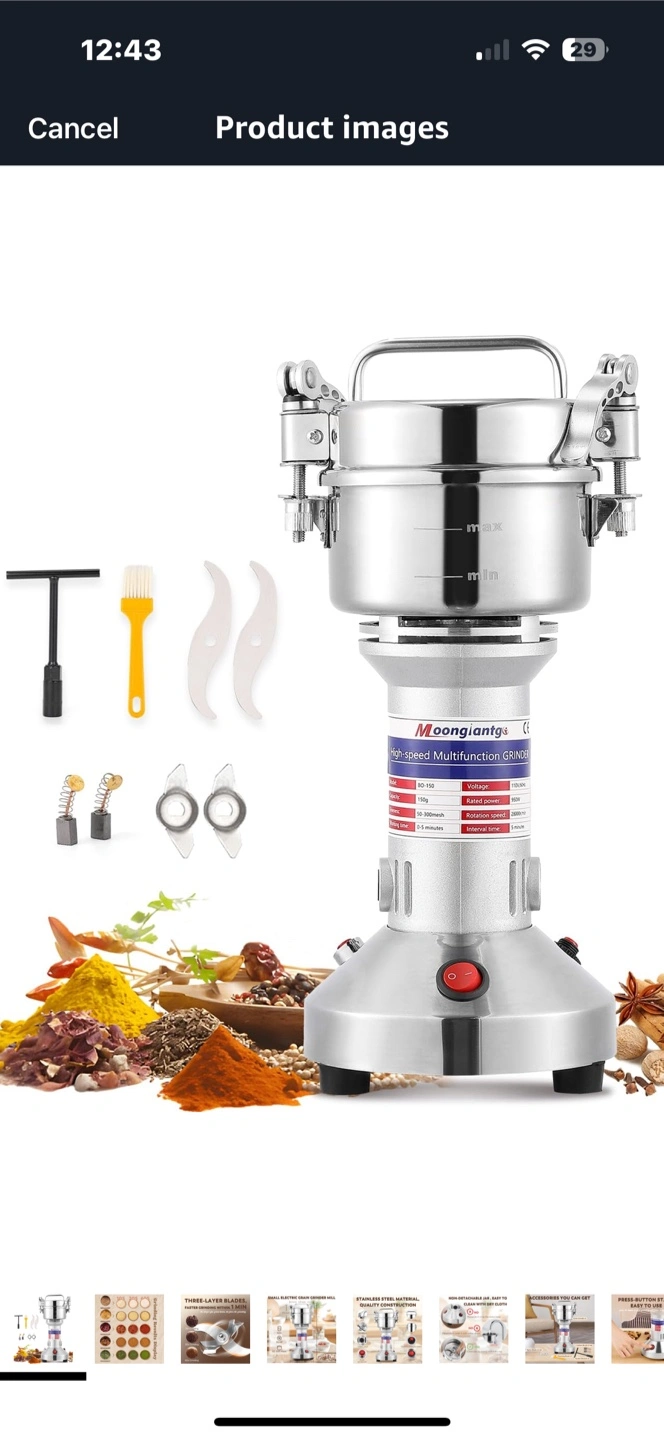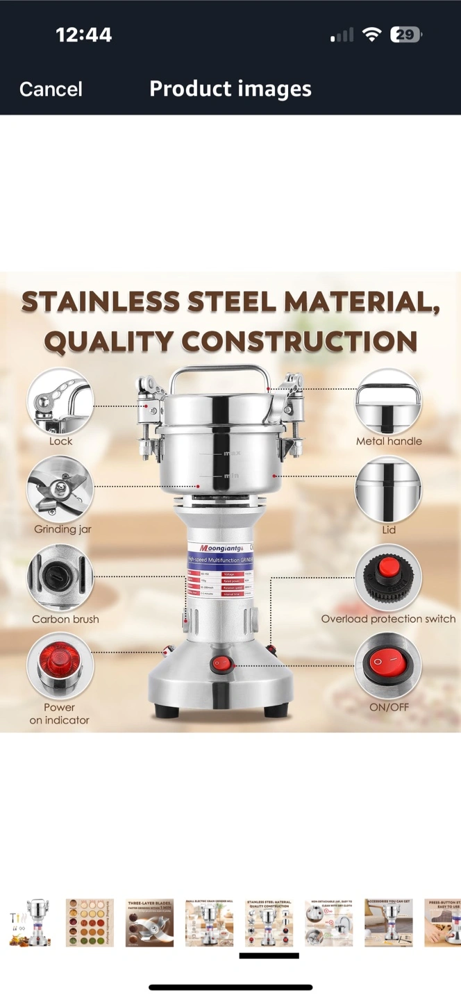 A grain grinder with stainless steel construction. Features multiple blades. Includes attachments like brushes and tools. A great addition to any kitchen to make fresh flour whenever you need it.