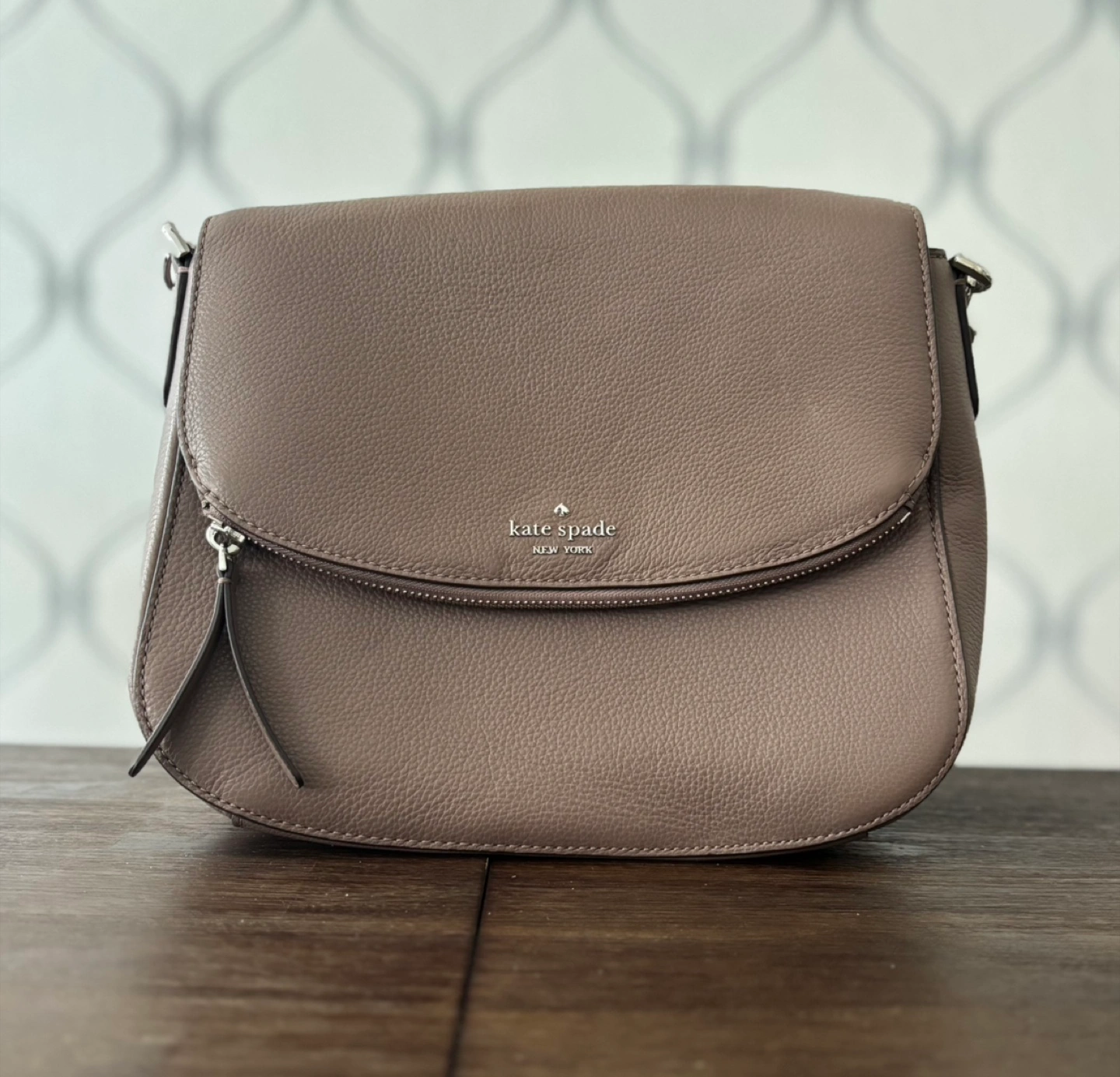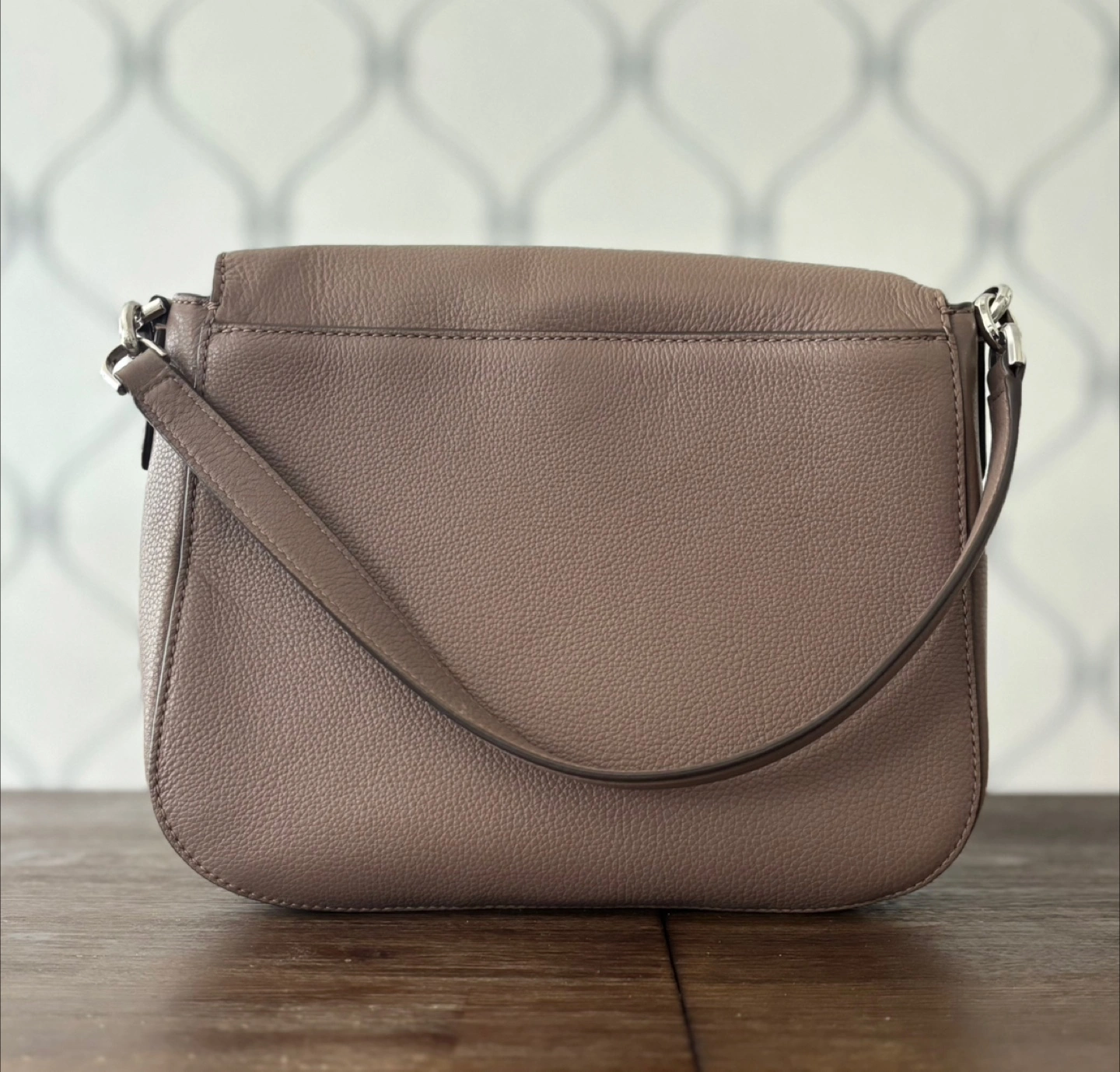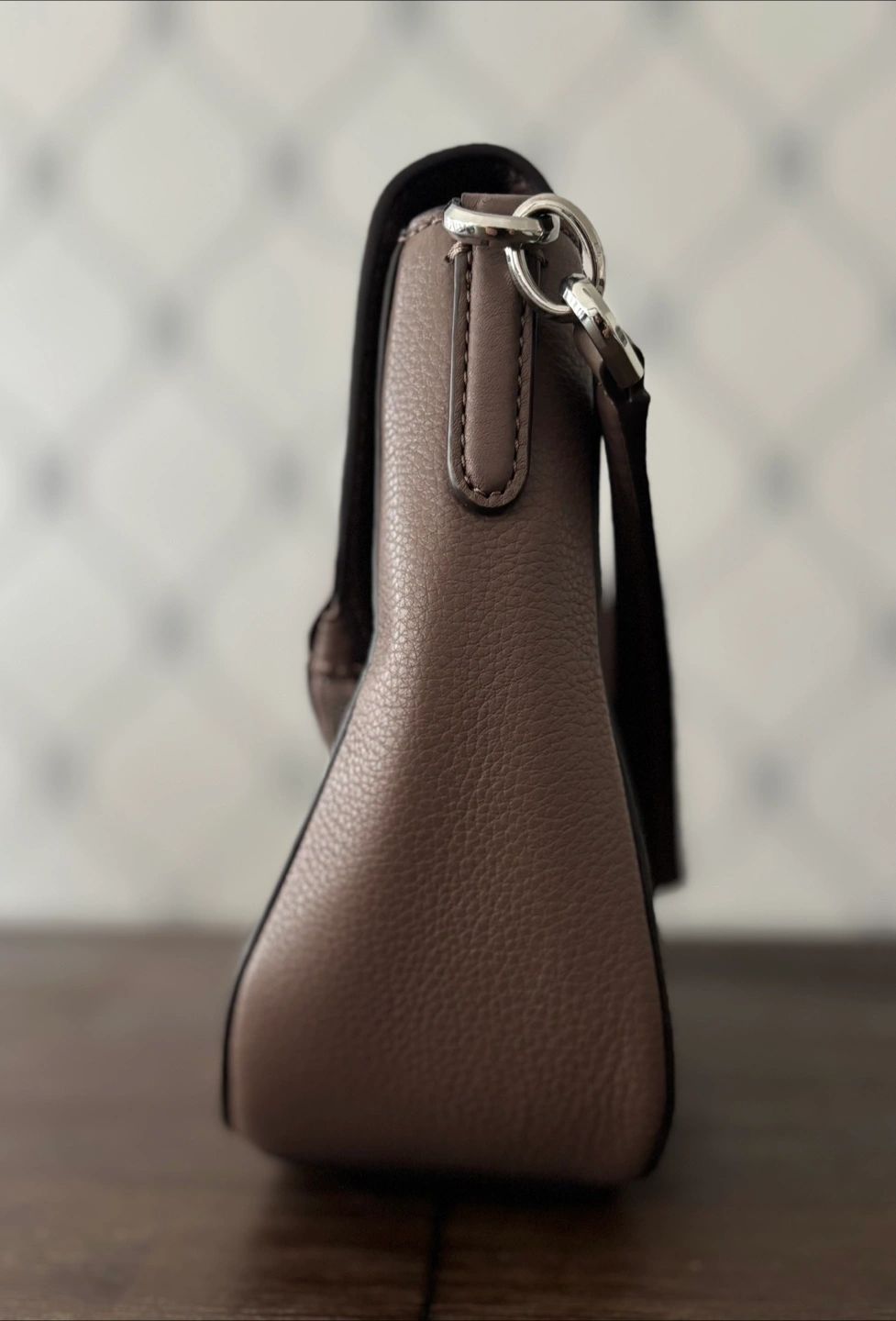 Lovely crossbody bag in a neutral taupe colour. Has a flap closure. Features a zippered pocket. Comfortable strap for wearing. You can use it to keep your essentials on hand while going for a walk. Never used.