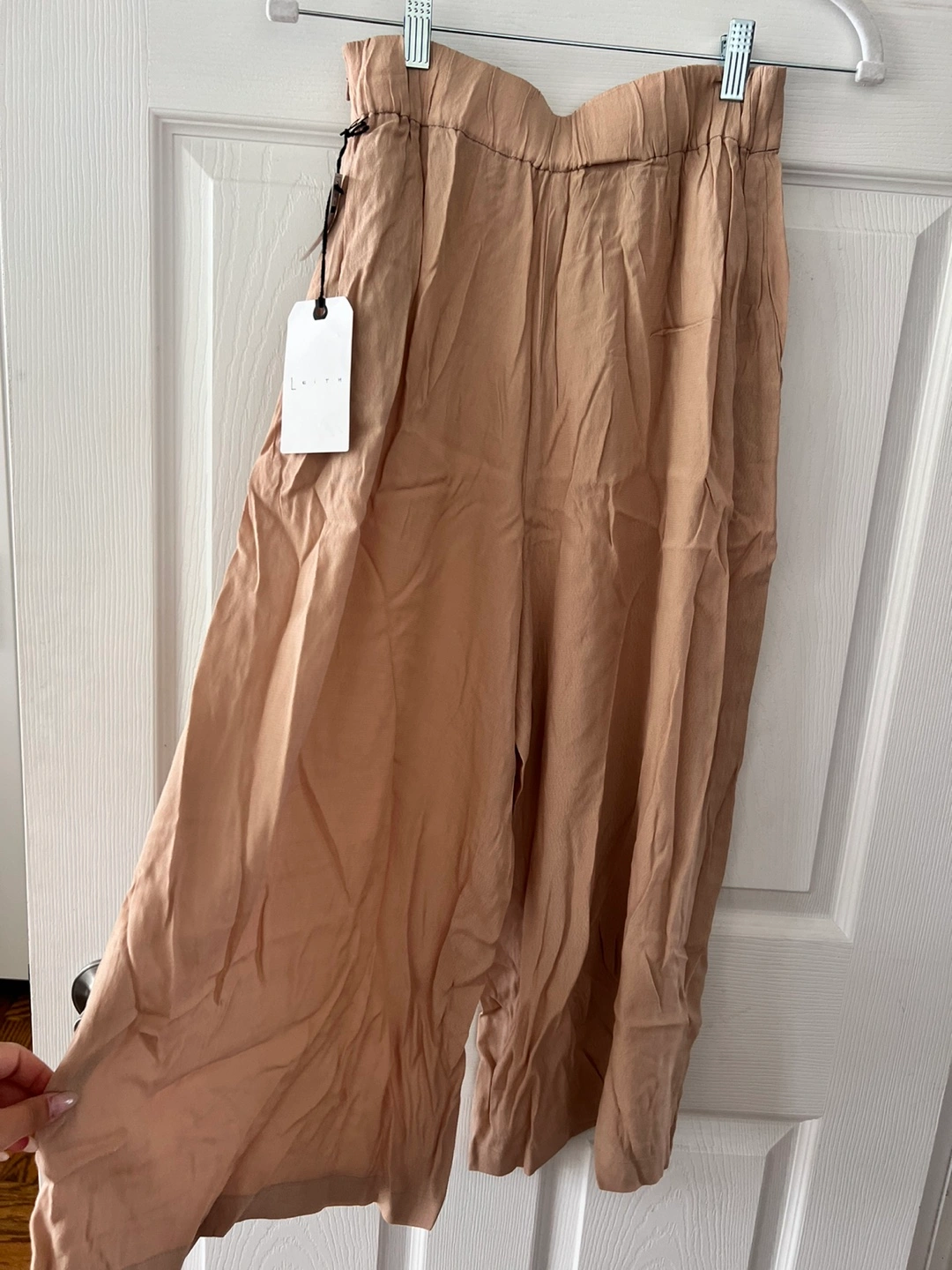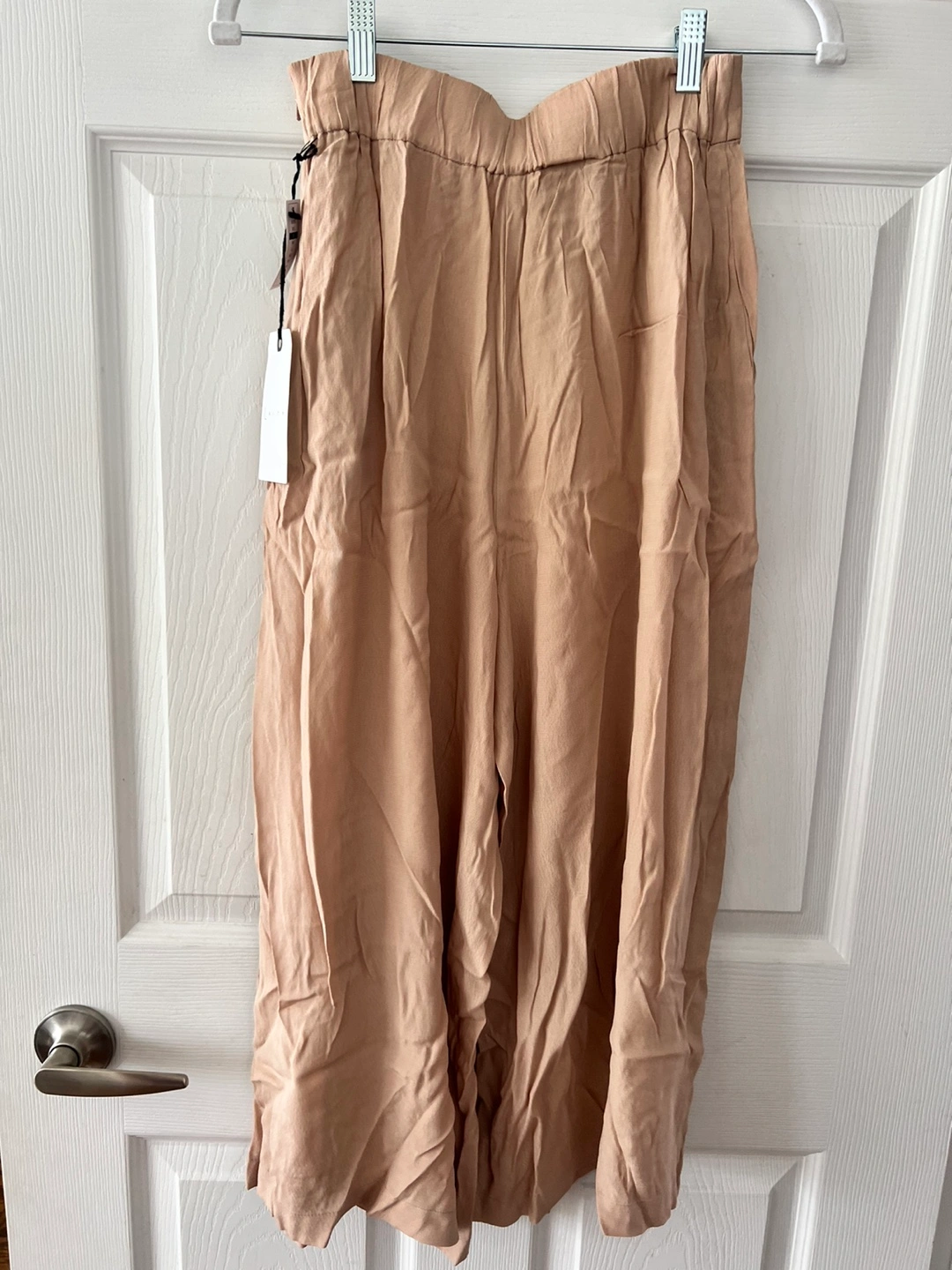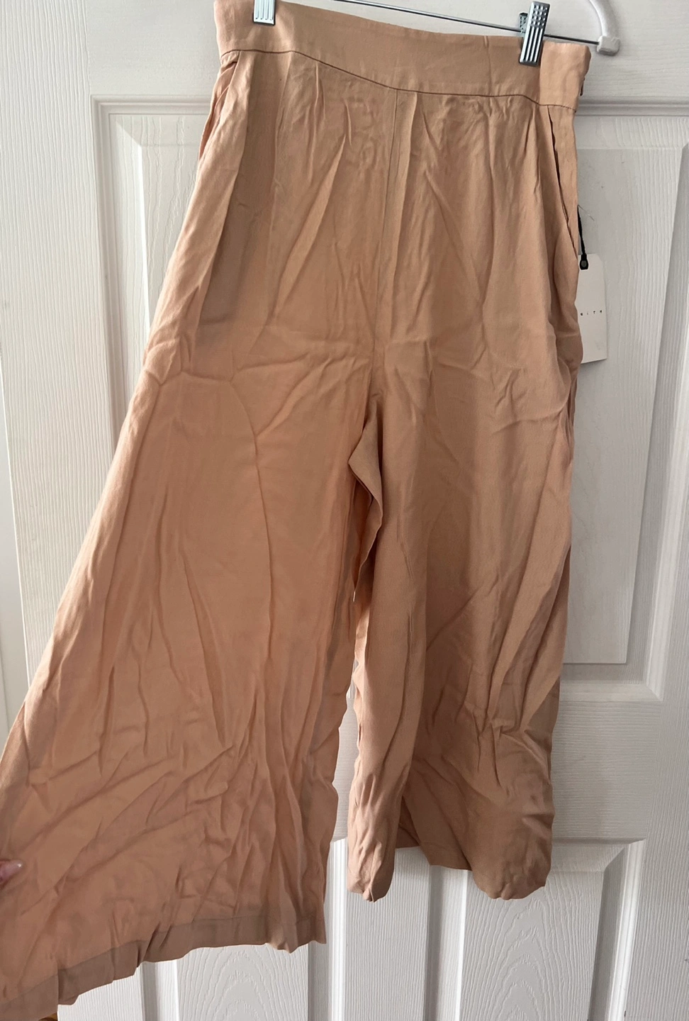 Light tan-coloured pants. The pants are a wide-leg style. A perfect addition to your wardrobe for everyday wear.