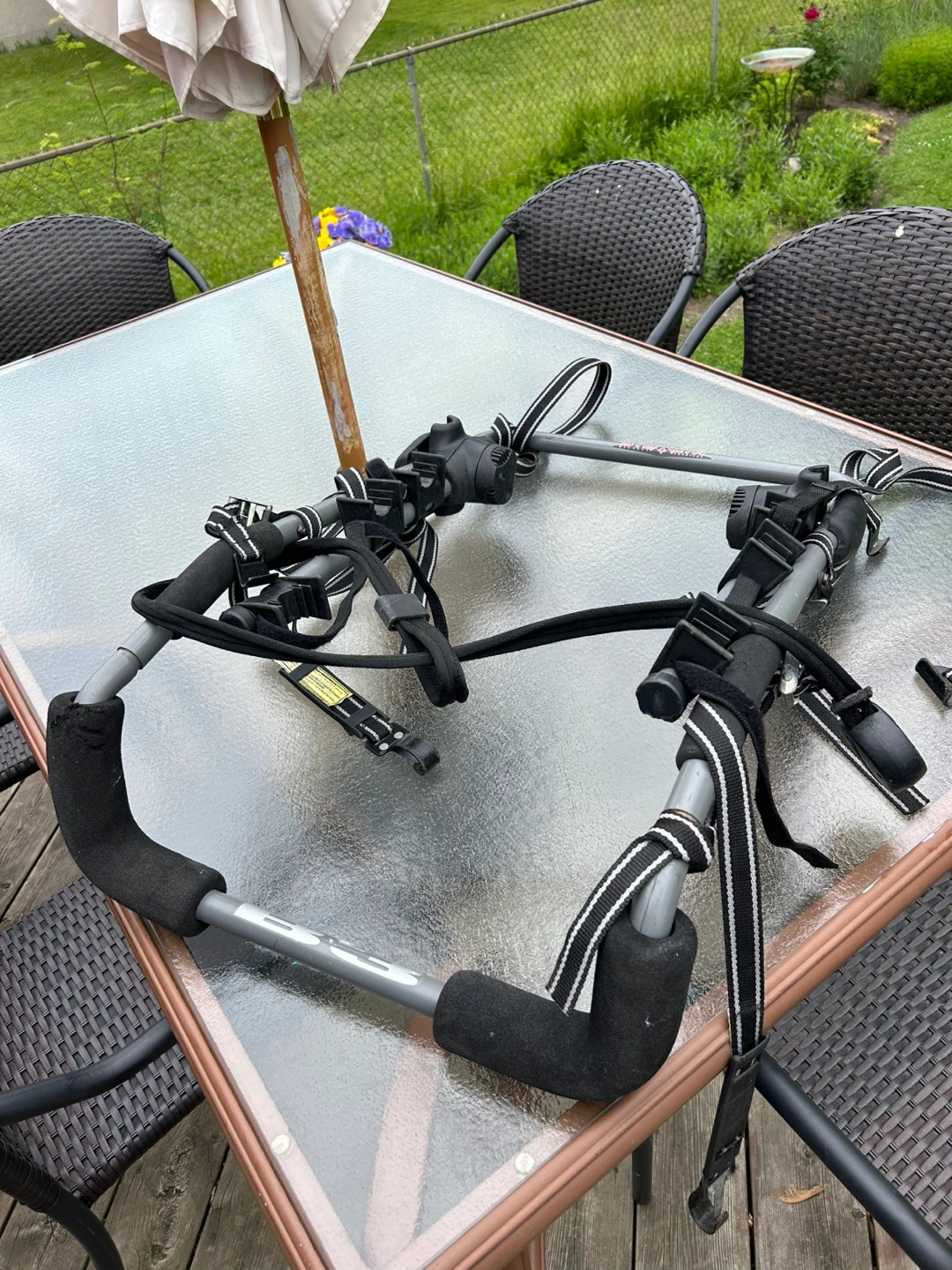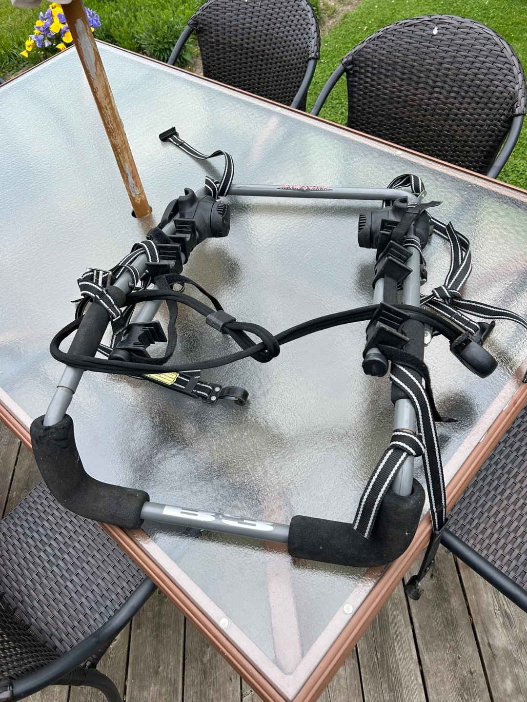 Bicycle rack. Foam padding on the bars, with multiple attachments for bike tires. This bicycle carrier would be great for any trip where you would like to bring along bikes.