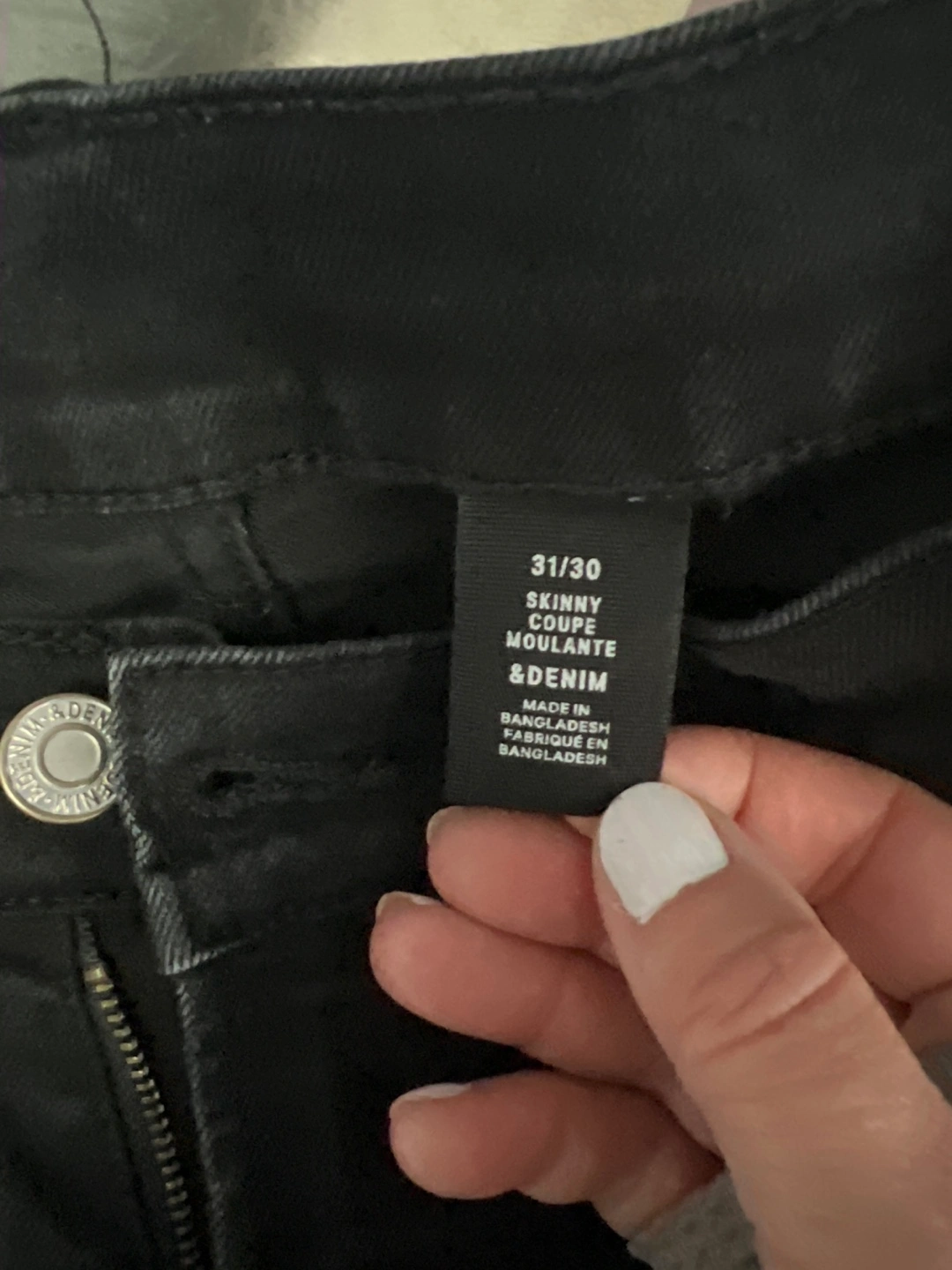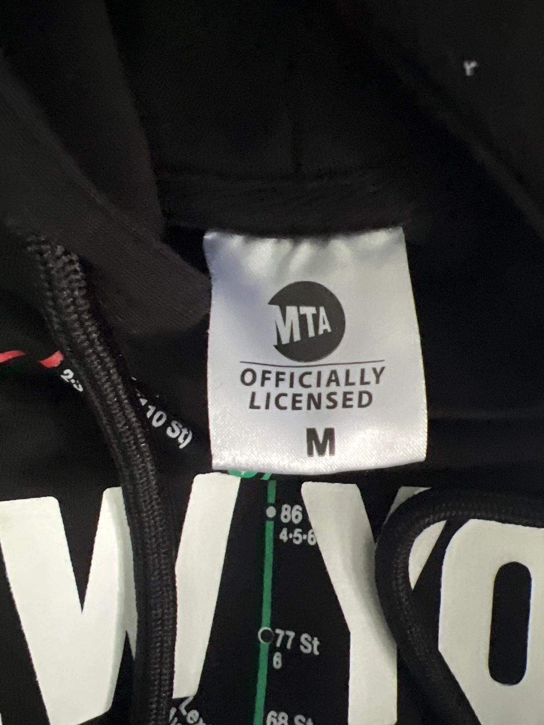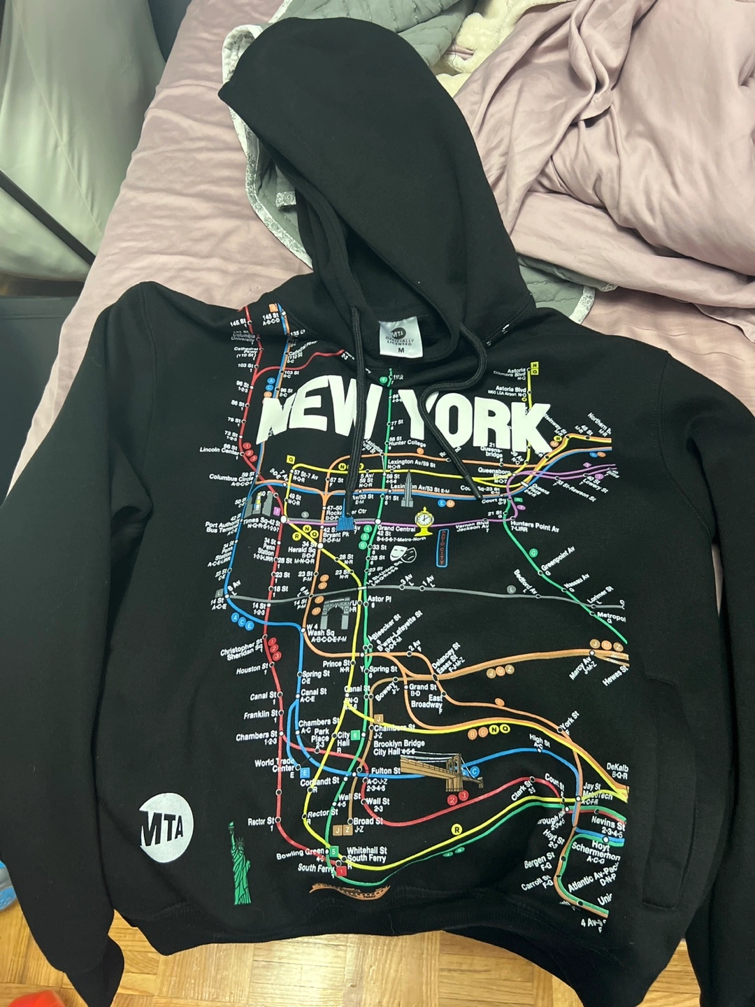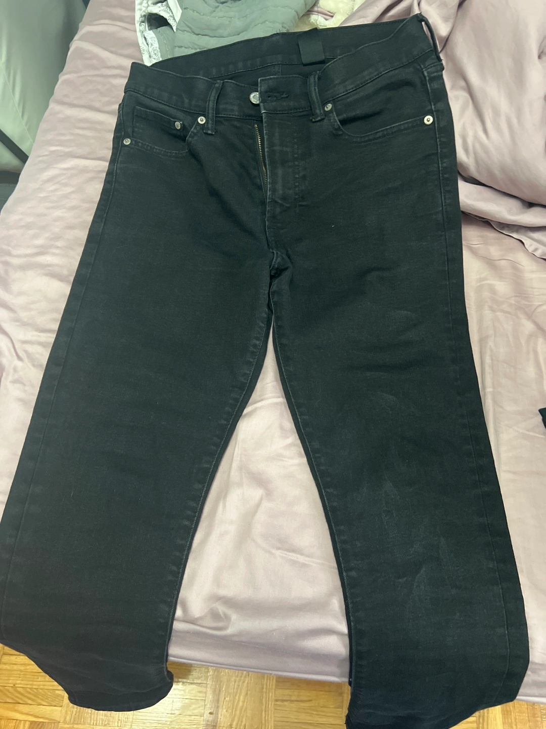 Black denim jeans with a button closure. Features the words & DENIM on the tag. Black hoodie with a map of New York printed on it. This would be great to wear on a relaxing day at home.