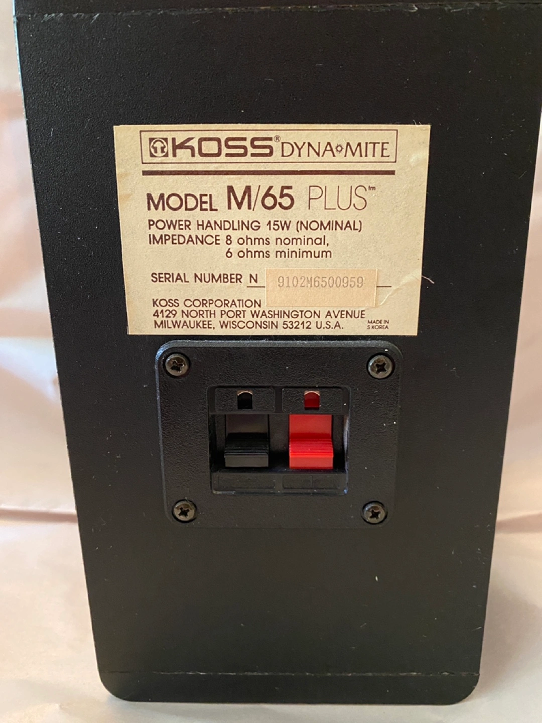 Model: M/65 Plus Power Handling: 15W (nominal) Impedance: 8 ohms nominal, 6 ohms minimum Serial Number: N 9102M6500059 (This looks like the serial number for one of the speakers) Manufacturer: Koss Corporation Measures 8.25" high x 4.75: wide x 5.75"d