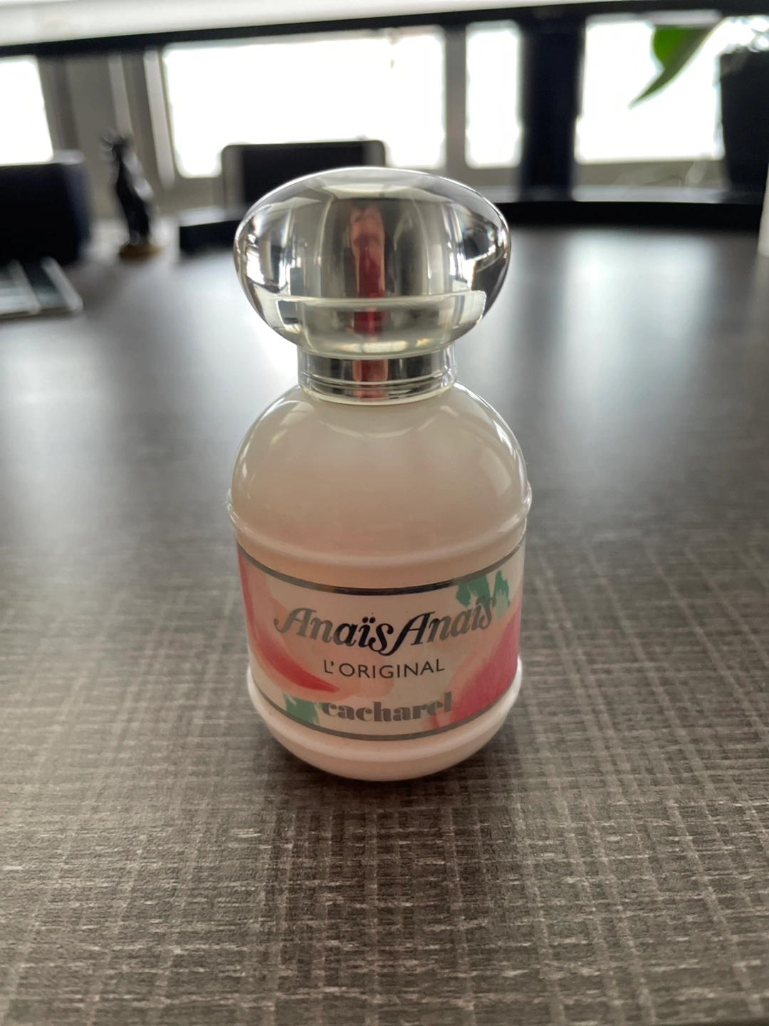 Perfume bottle with a clear, rounded top. White with a pink and green design, it has a label that reads "Anaïs Anaïs L'Original". Consider spritzing a bit of this perfume for a relaxing evening at home.