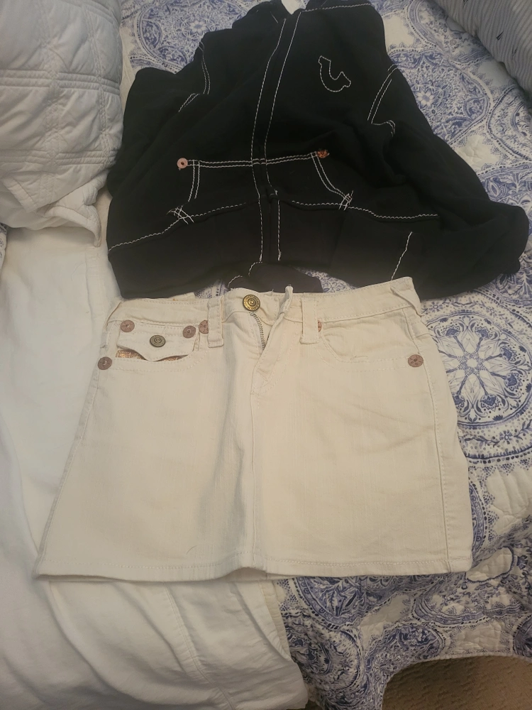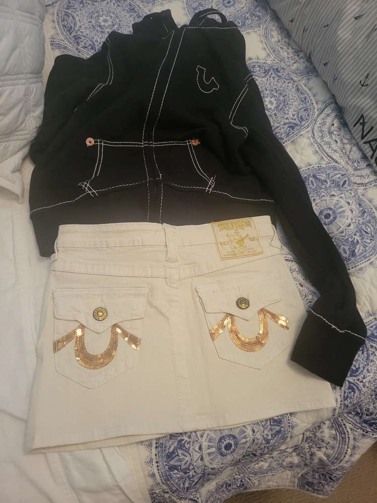 A black hooded zip-up jacket. It features white stitching details. A white denim skirt with sequined pockets. Wearing this set can be the perfect addition to an evening out.