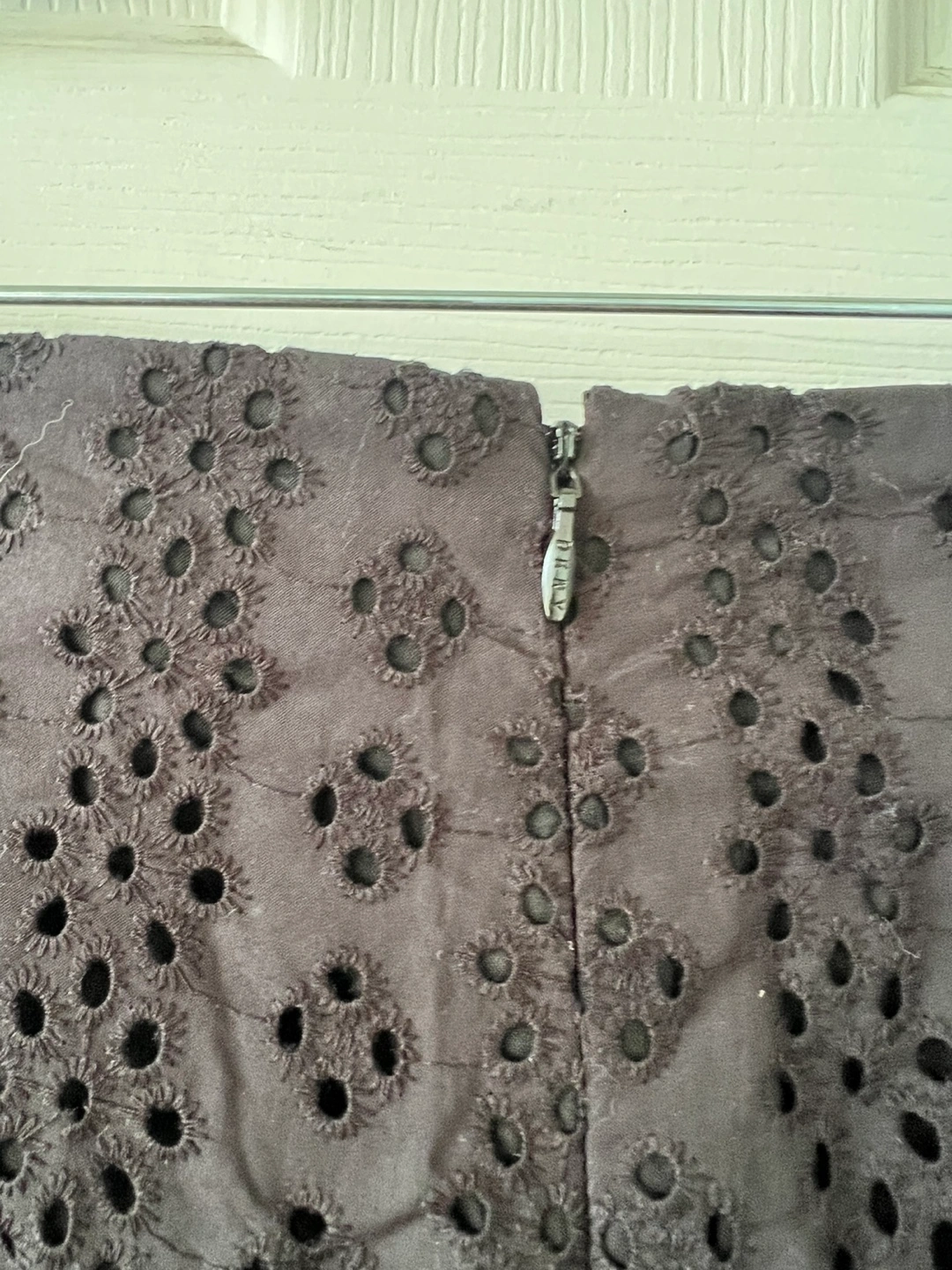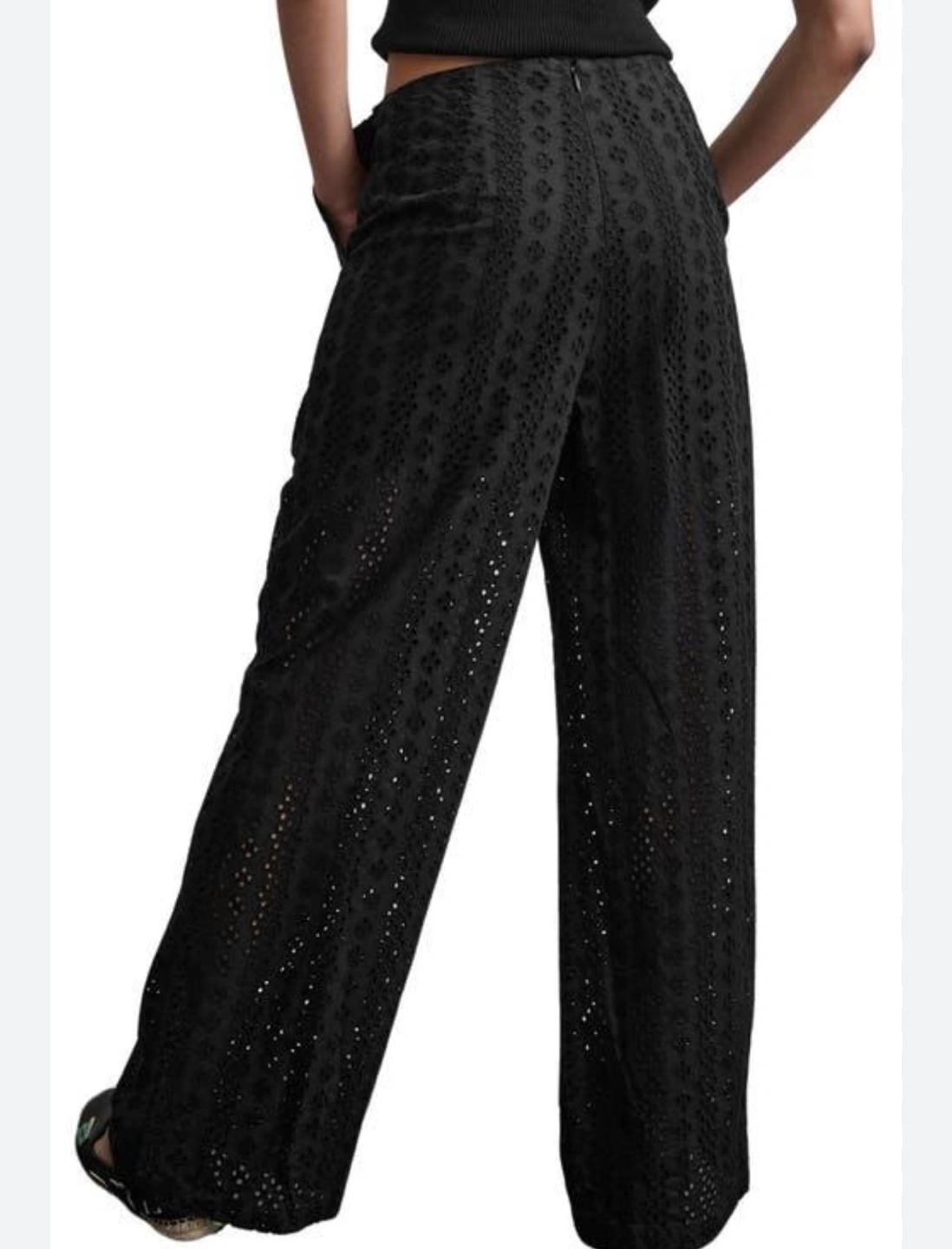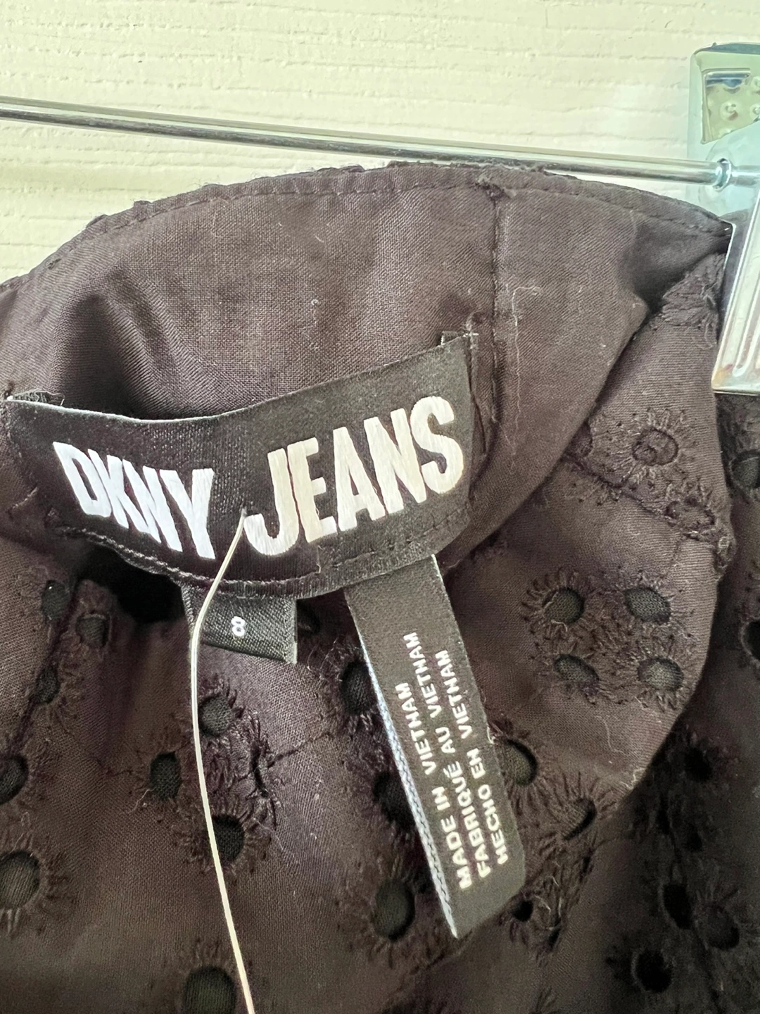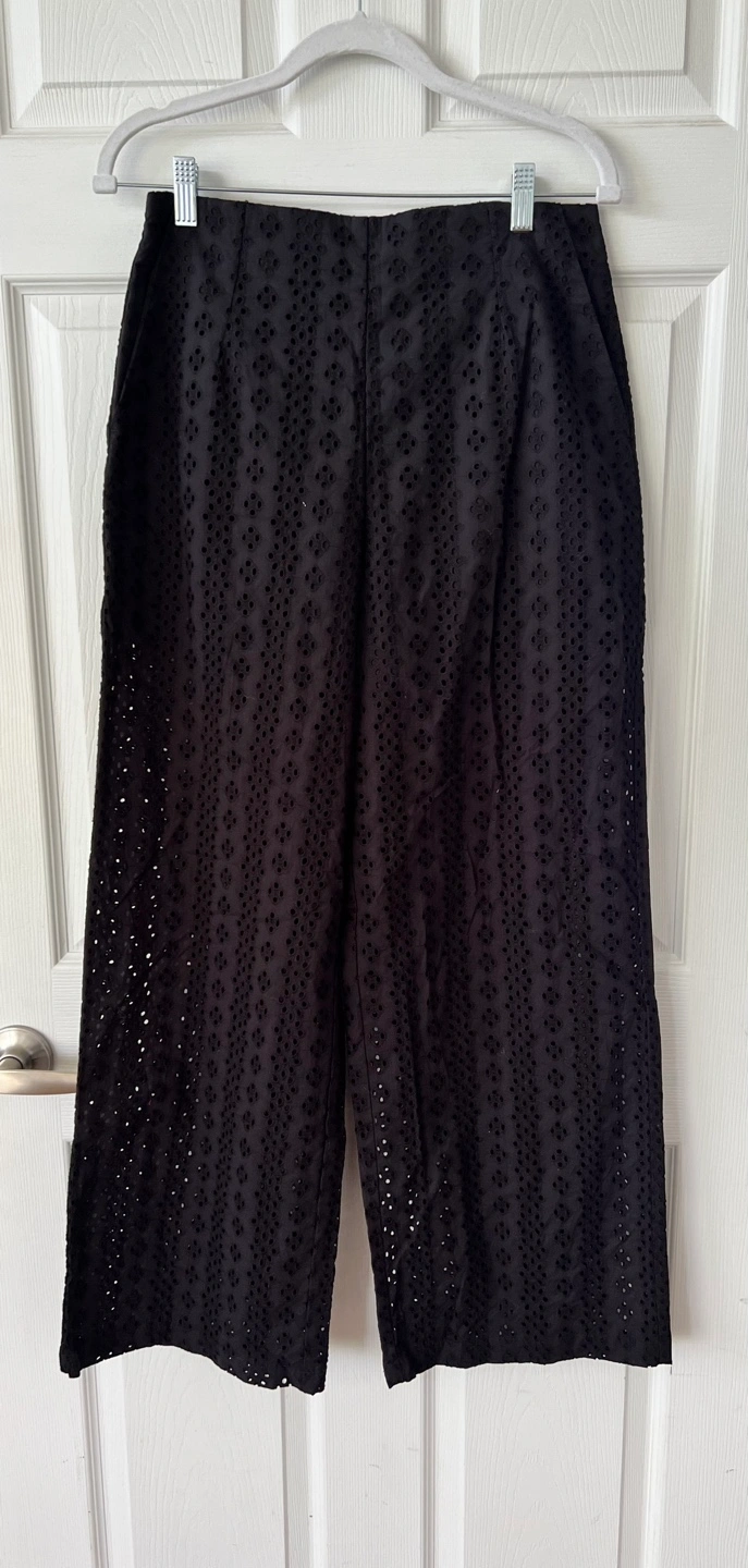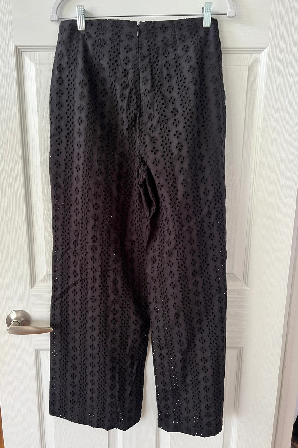 Offering these black laser cut pants from DKNY JEANS. Pants feature a button and zipper closure. They would be lovely to wear during a calm evening.