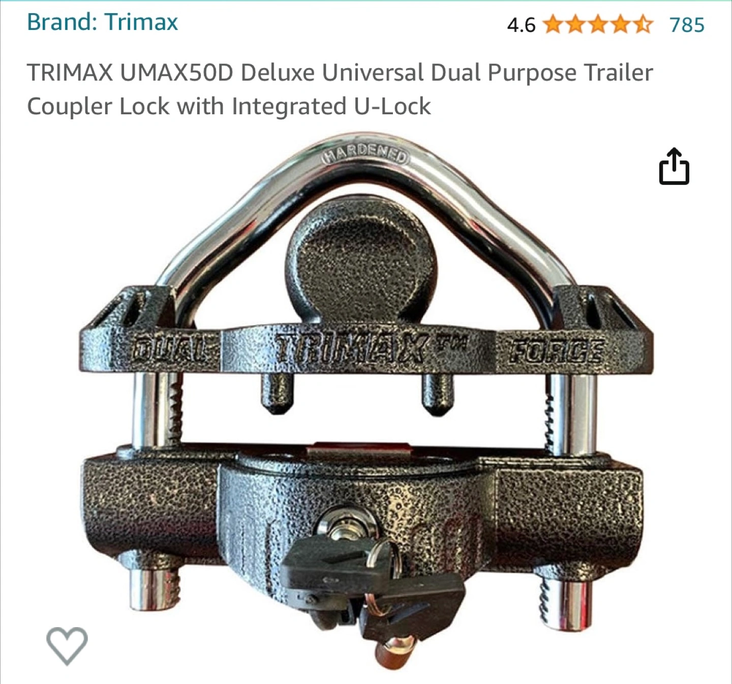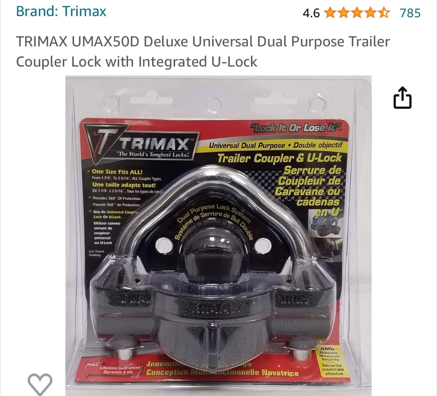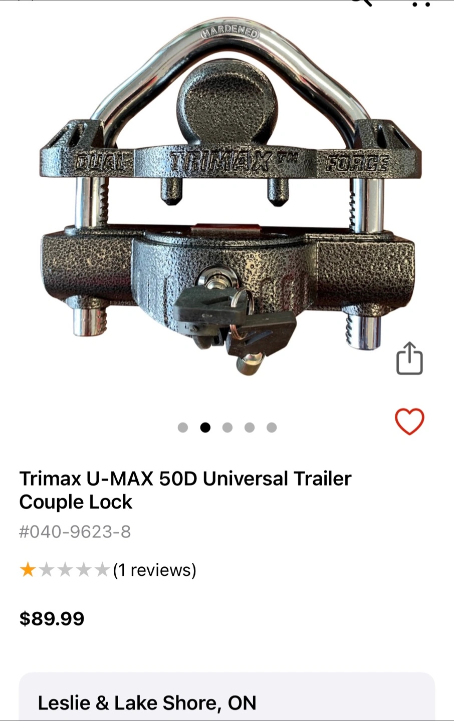 A trailer coupler lock. Includes a U-Lock. Designed for various coupler types. Made with durable materials. Helps keep things secure. This item can bring peace of mind during travel. Trimax Universe Trailer Lock model Umax50D for all size ball and hitch brand new never used in original packaging, comes with two keys as well and a lifetime replacement cost without receipt if anything goes wrong, see guarantee on packaging. Cost $90 + tax l'm asking lot less. I also have the same Trimax Trailer lock model Umax100D only difference the 100 has a protective cover hence a little more expensive. If item is still here, it's still available. First come first served or whoever pays first. I accept etransfers and live near CN Tower. Free of smoke and pet odours and delivery available in some cases. Check out other items seller has!!