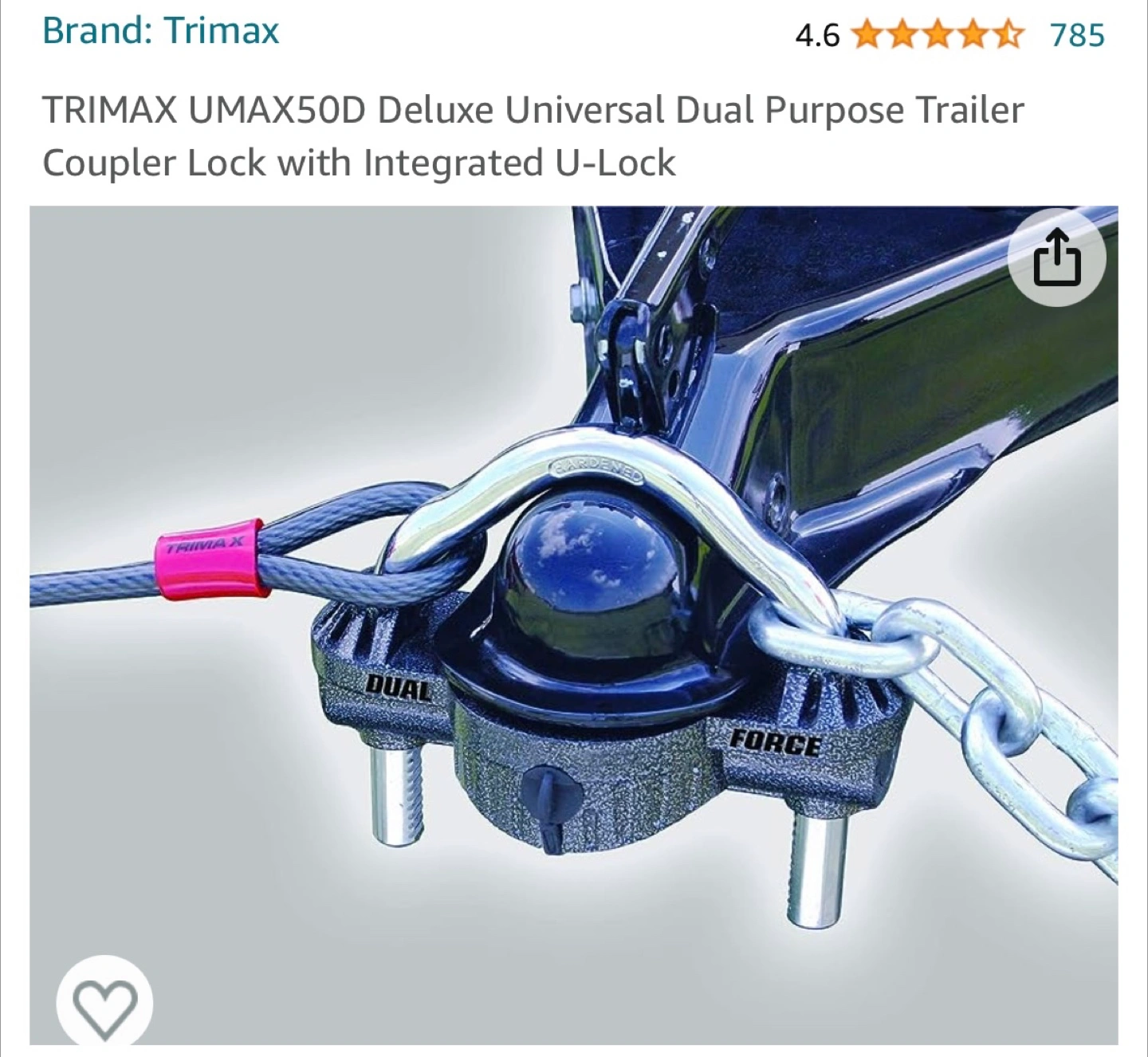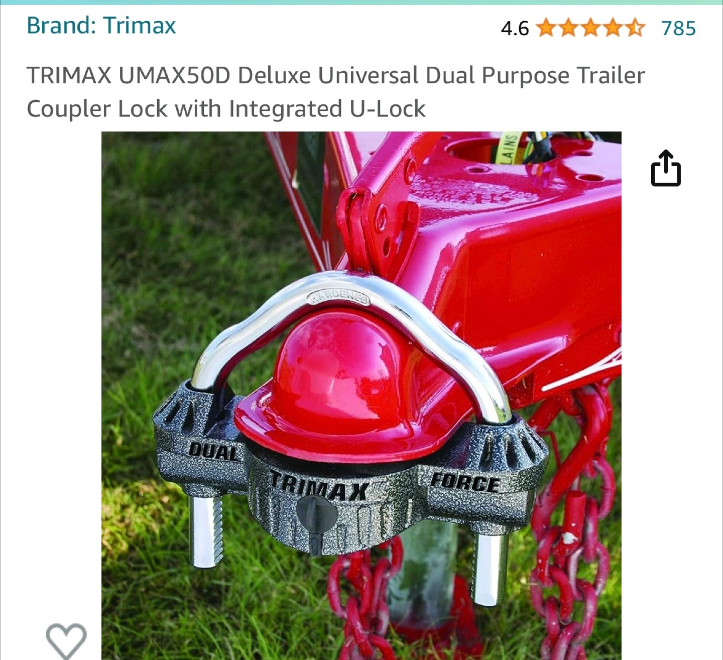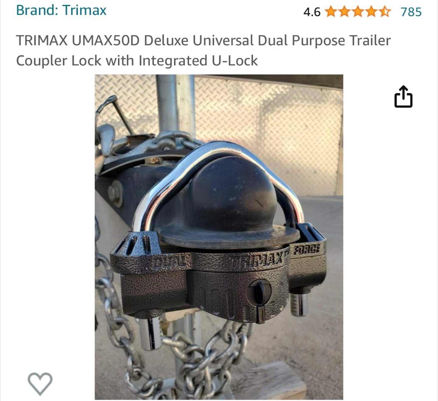A trailer coupler lock. Includes a U-Lock. Designed for various coupler types. Made with durable materials. Helps keep things secure. This item can bring peace of mind during travel. Trimax Universe Trailer Lock model Umax50D for all size ball and hitch brand new never used in original packaging, comes with two keys as well and a lifetime replacement cost without receipt if anything goes wrong, see guarantee on packaging. Cost $90 + tax l'm asking lot less. I also have the same Trimax Trailer lock model Umax100D only difference the 100 has a protective cover hence a little more expensive. If item is still here, it's still available. First come first served or whoever pays first. I accept etransfers and live near CN Tower. Free of smoke and pet odours and delivery available in some cases. Check out other items seller has!!