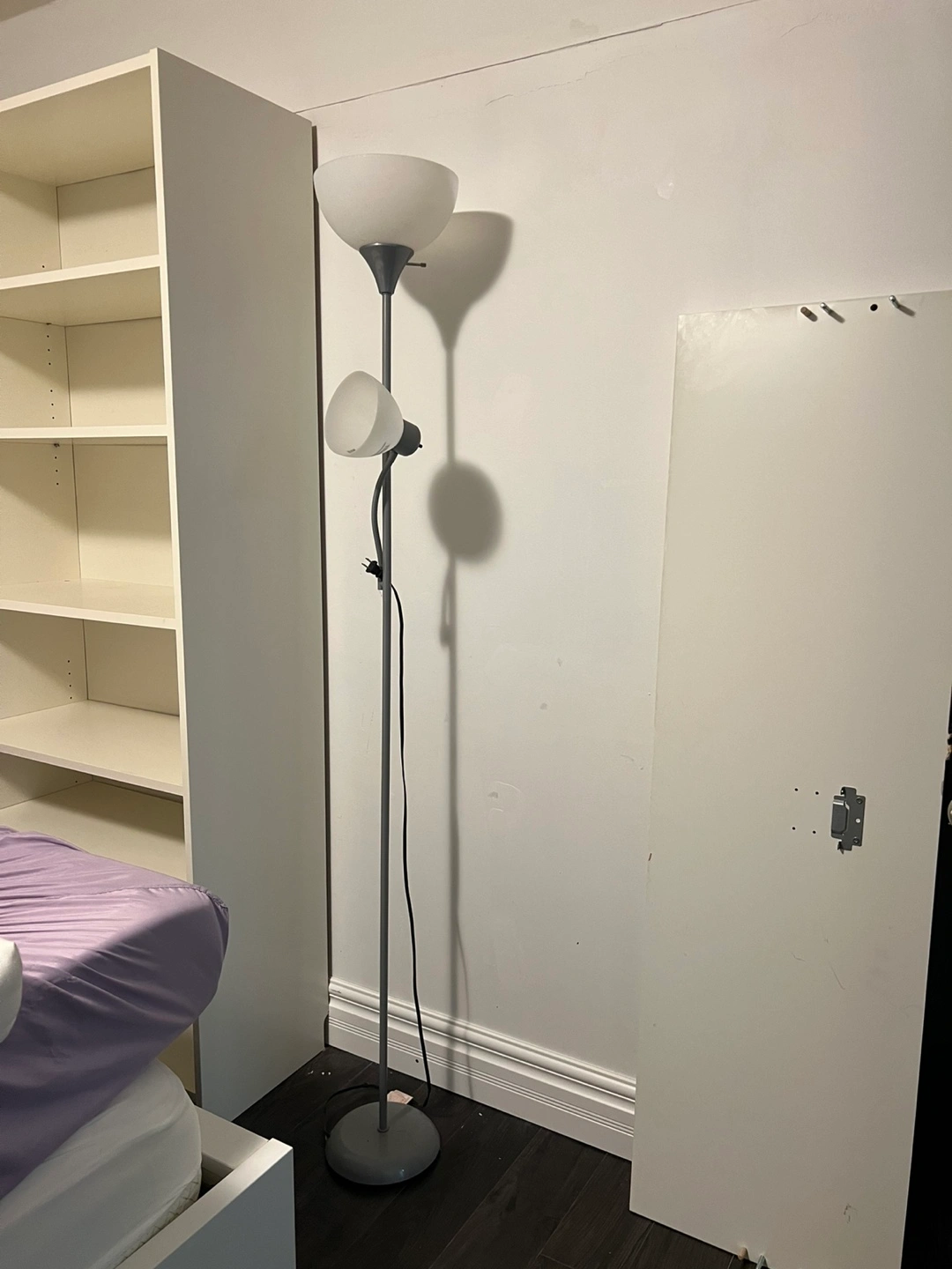 It is a floor lamp with two lampshades. The stand is grey with a round base. It has a cord. This lamp will add to any space and make it feel warmer and cozier.