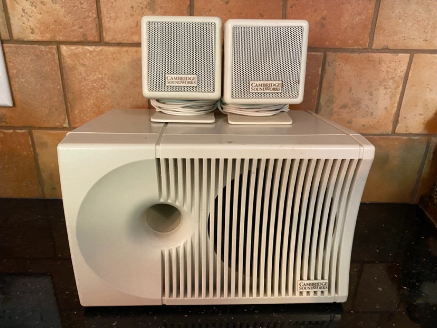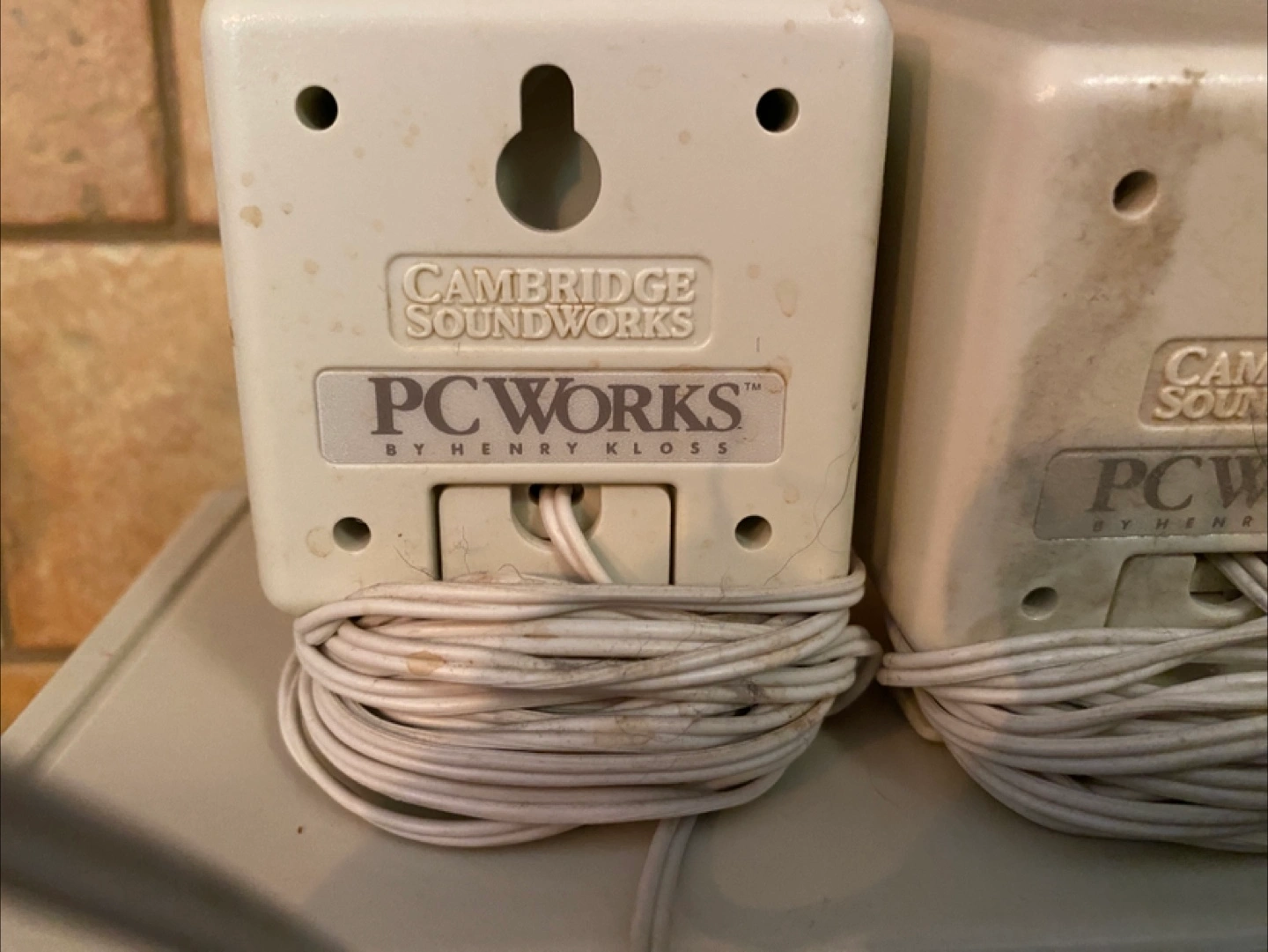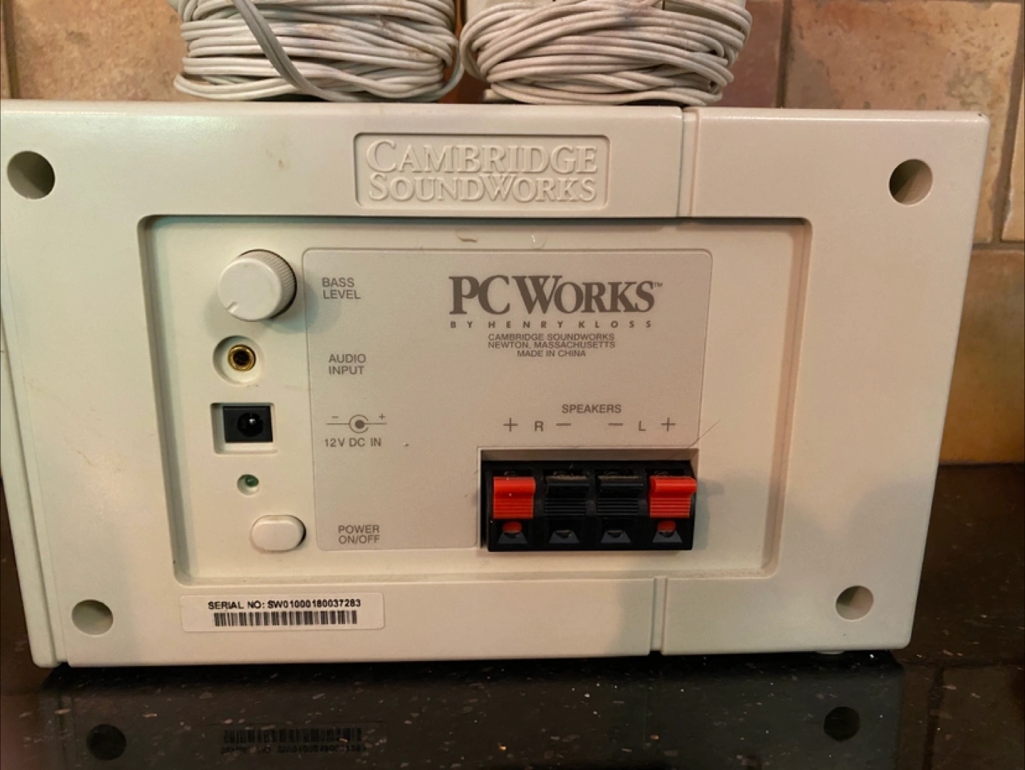 One subwoofer unit Two satellite speakers One inline volume control attached to the wiring for the satellite speakers A "Bass Level" knob. An "Audio Input" jack. A "12V DC IN" power input. A "Power ON/OFF" button. Speaker terminals for connecting the two satellite speakers (+R, -R, +L, -L). A serial number: SWQ1000180037283.