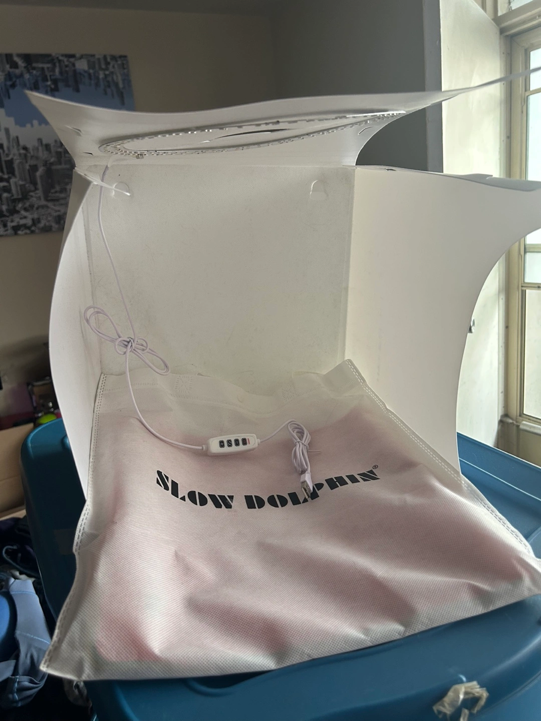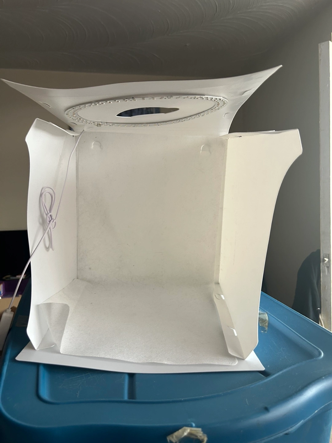 A white photo studio box with LED lights. Contains a carrying case. An ideal choice for photography enthusiasts, allowing for well-lit photos.
