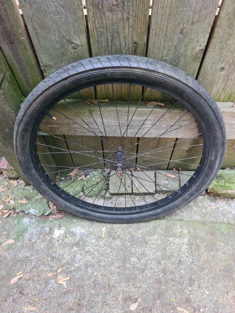 Bike wheel with a black tire. Spoke wheel with a black rim. You could fix your bike with this wheel. 26 x 2.125
