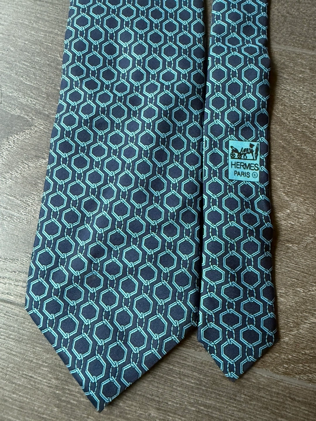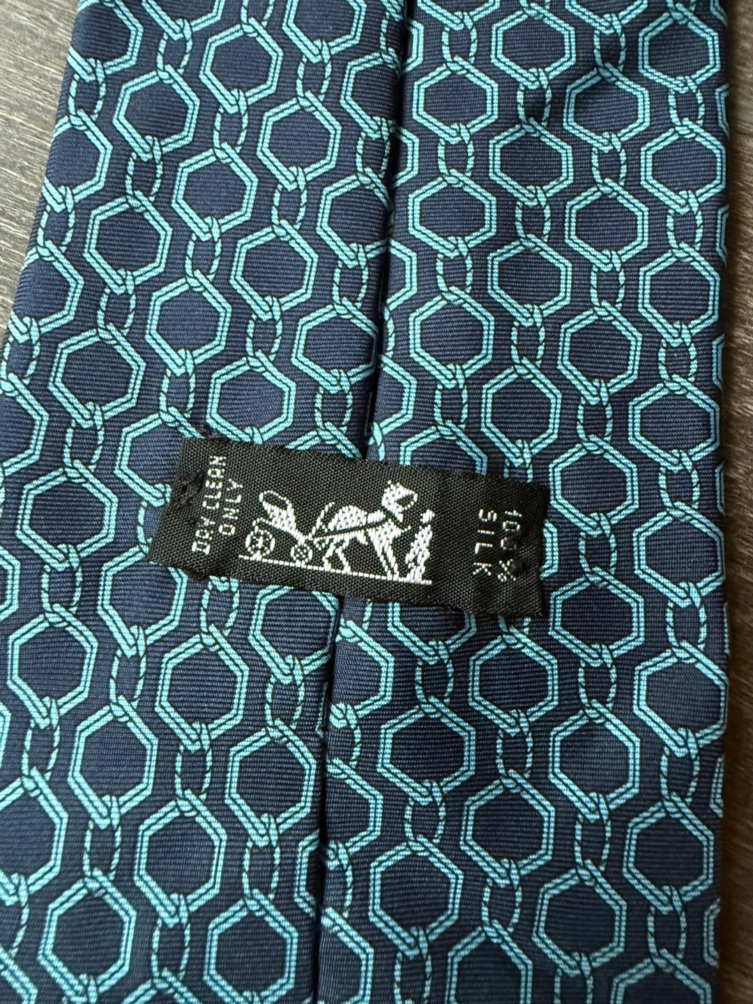 Authentic Hermes silk tie. Navy and light blue patterned silk tie. Features a geometric design. A perfect accessory for any formal occasion. Great condition