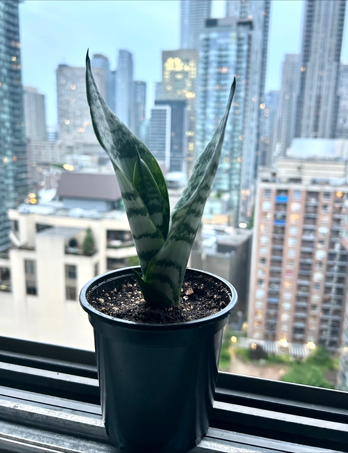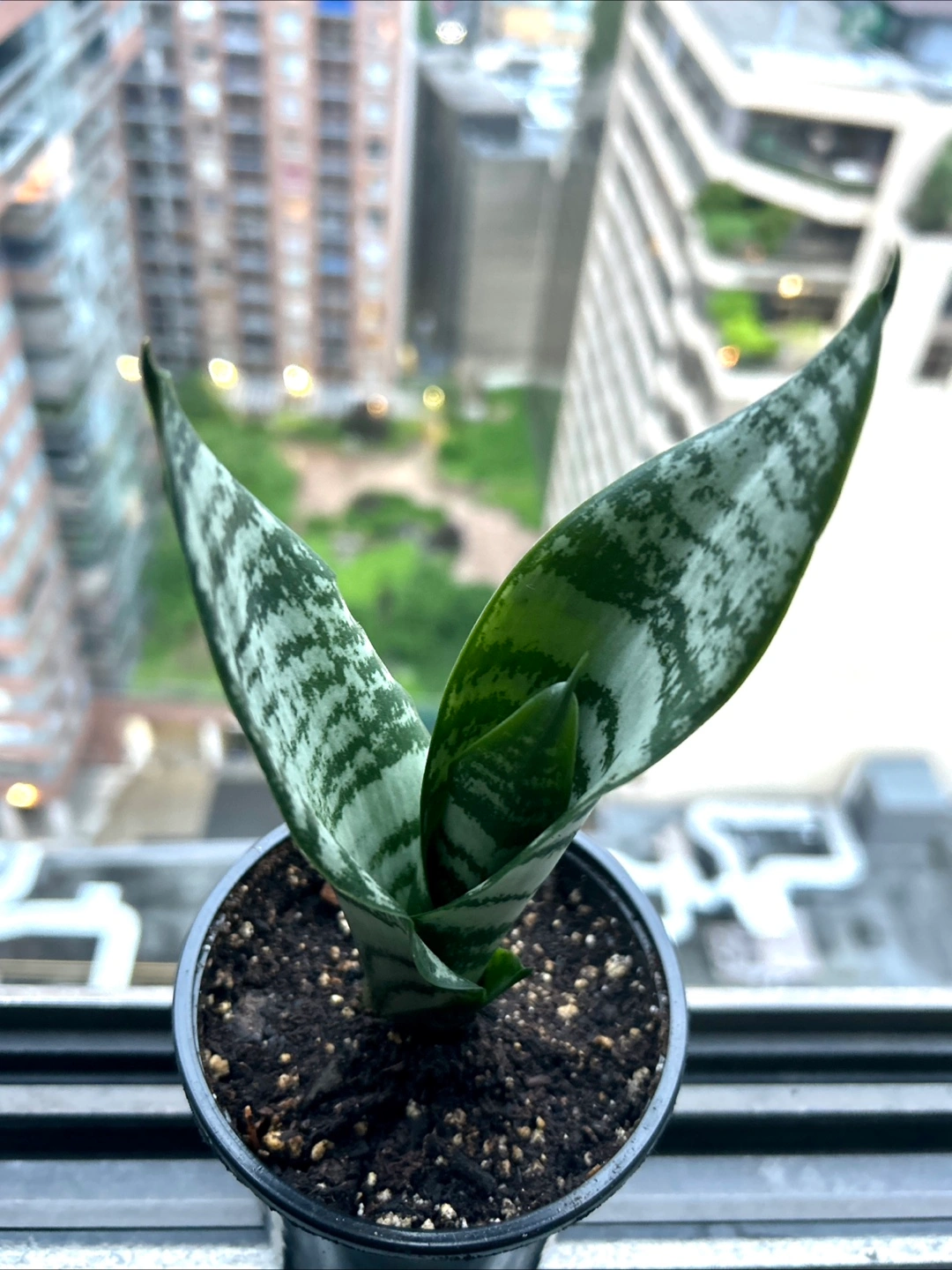 A potted baby snake plant with patterned leaves.