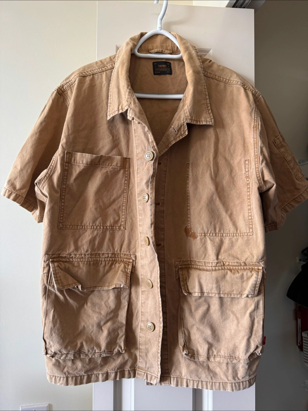 Beige coloured work jacket. Features short sleeves and multiple pockets. Number 714 printed on the back. L size Pickup at Joyce Collingwood skytrain station