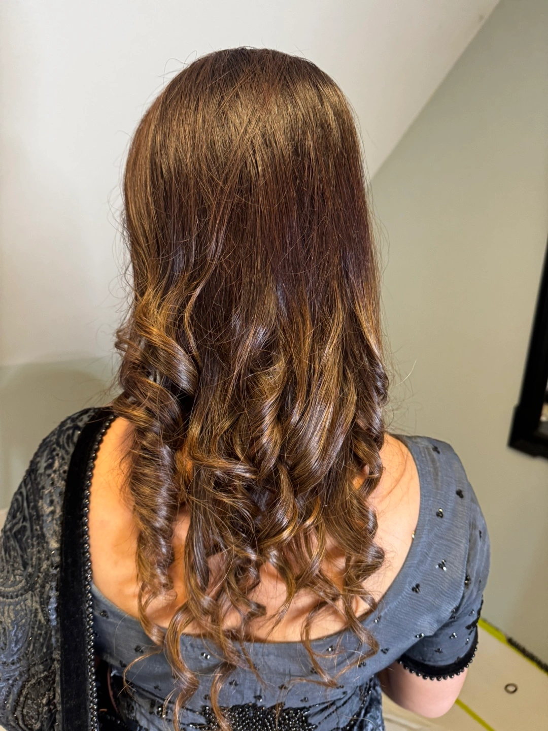 A stunning hairstyle that exudes elegance. The hair appears to be expertly styled. The hairstyle looks lovely in any setting, with varying degrees of curl and texture. A great hairstyle to make you feel beautiful.
