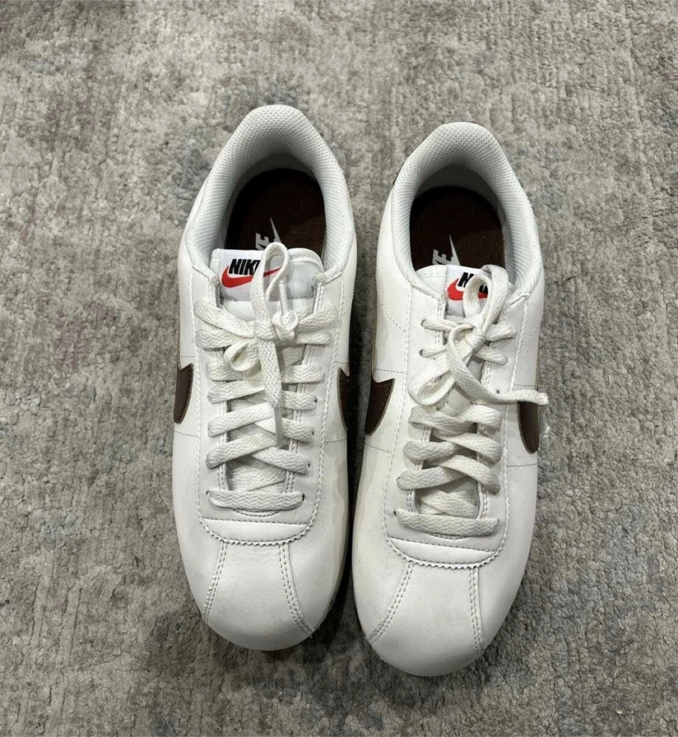 White sneakers with brown details. White shoelaces. A perfect choice for a walk on a sunny day.
