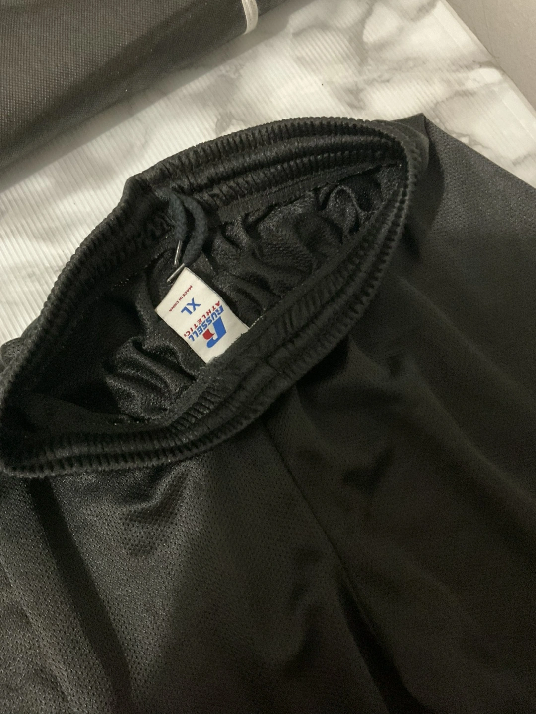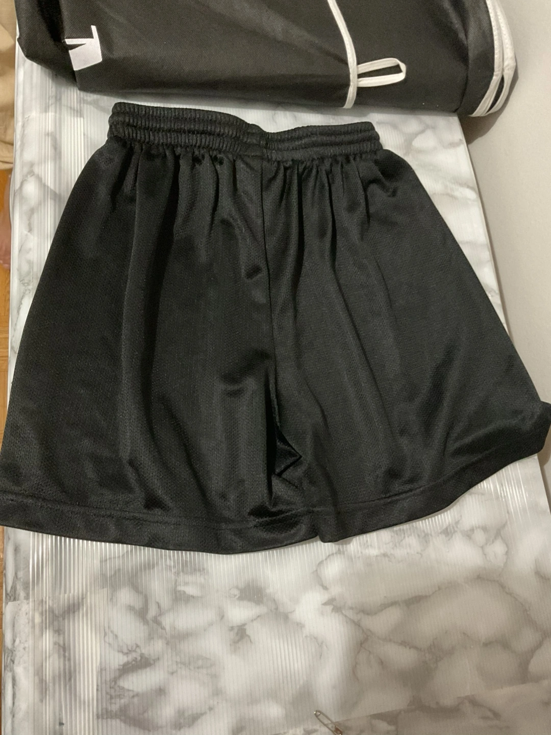 Black athletic shorts. With a drawstring waist. The shorts look to be made of mesh. A perfect item for a quick workout or a casual day out.