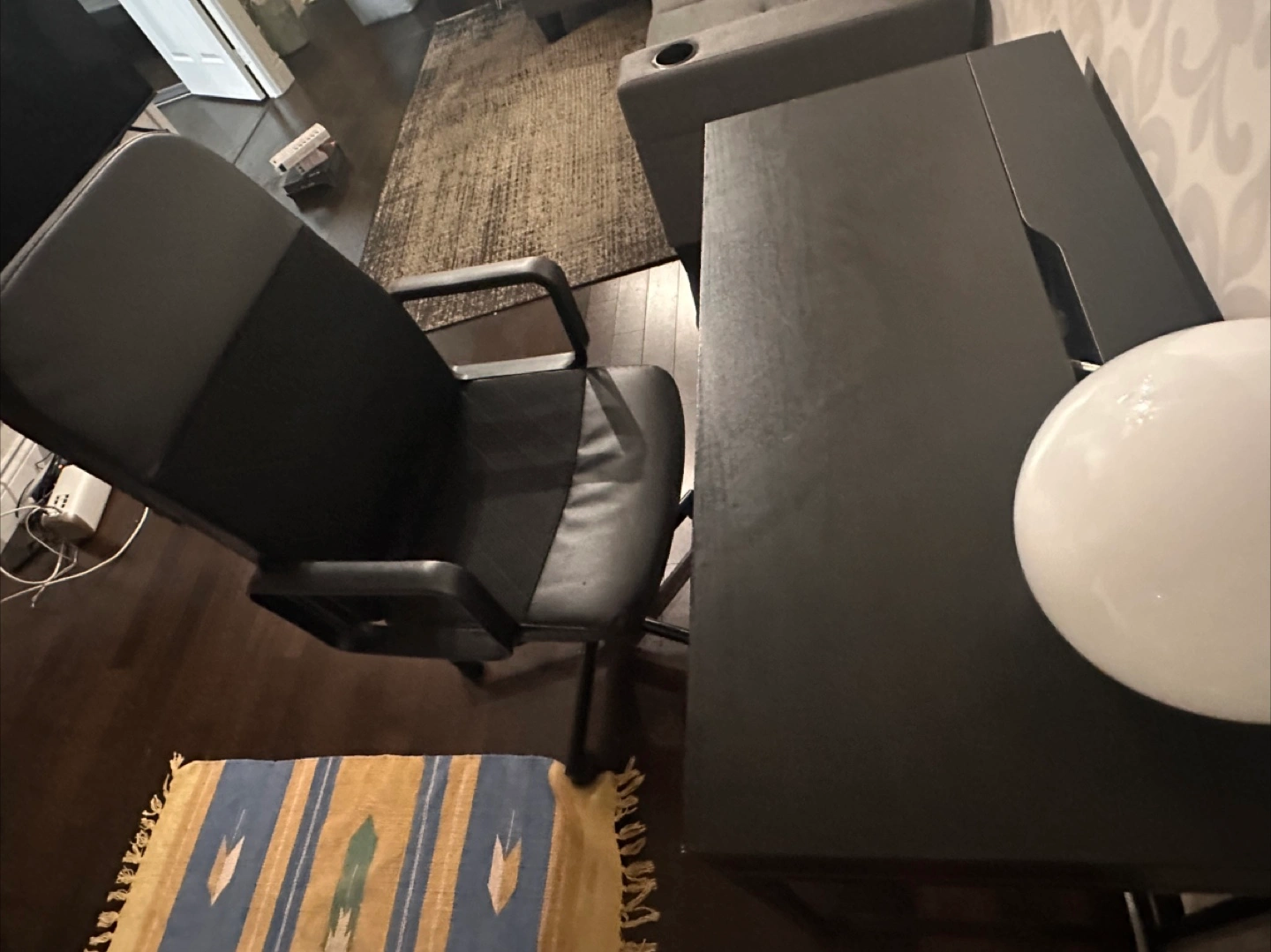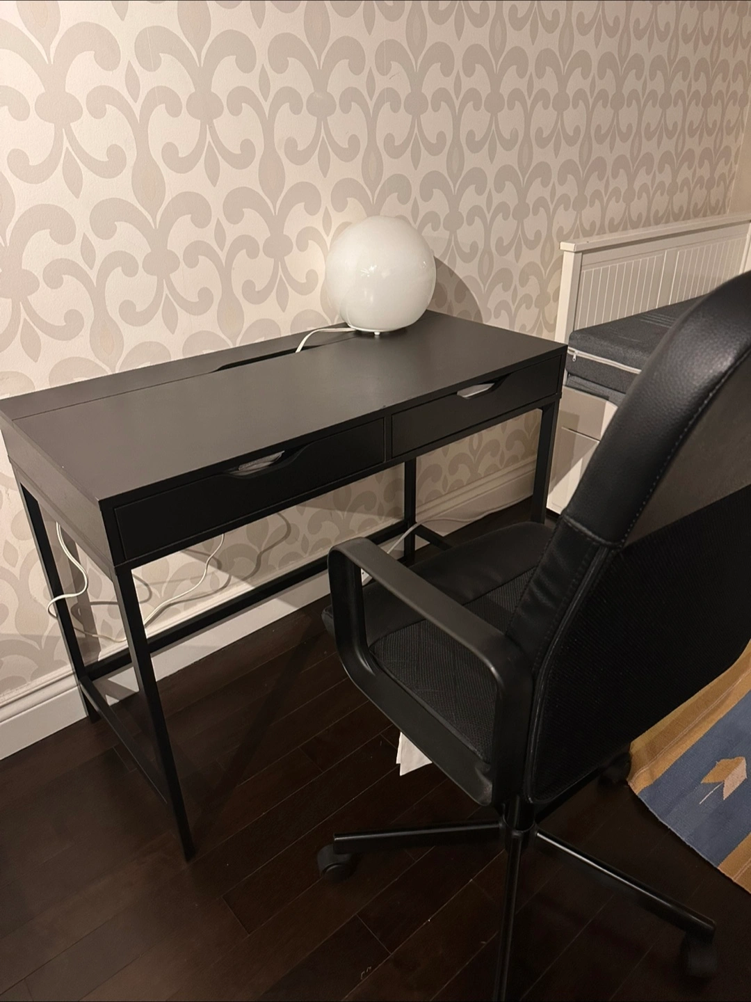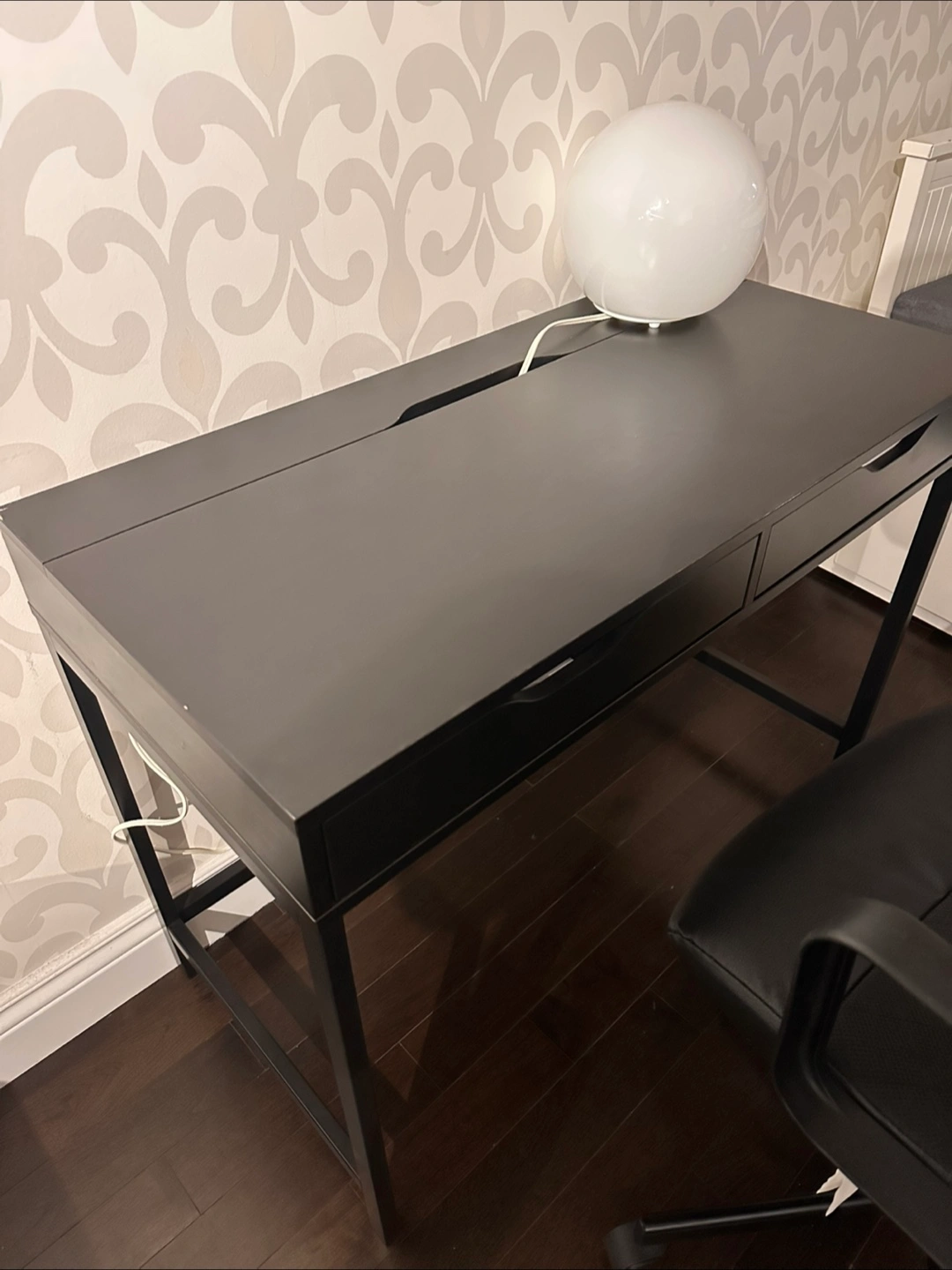 This is ikea furniture in very good condition with manual to set up available. Also, tools to dismantle and arrange available with ikea model number. A modern black working desk featuring two drawers. A matching black chair extremely comfortable with perfect cushion for back and seating completes the set. You will love having this desk in your home to assist with your creative pursuits.