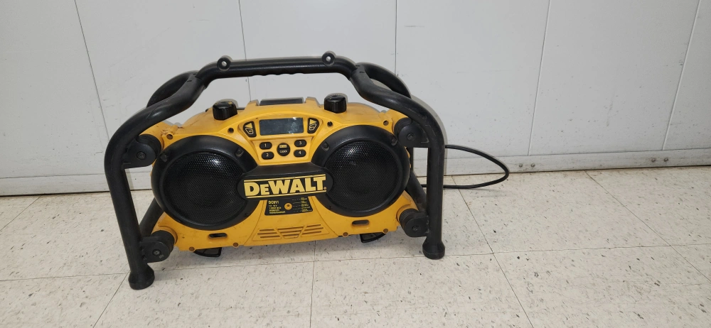 Yellow and black colour scheme. Has a black handle and feet. Features two speakers. Would be a good companion when working on a project.
