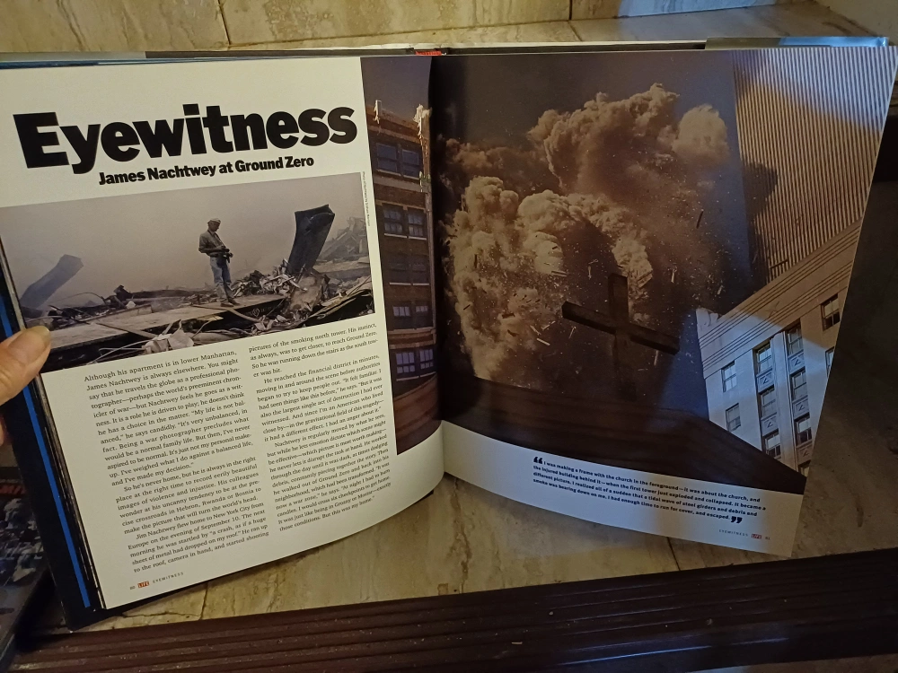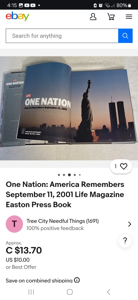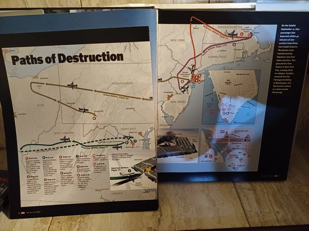 A LIFE Book titled One Nation, America Remembers September 11, 2001. A few pages have become unattached from the front of the book, but are included with the book, as seen in the photos. Last photo shows a DVD beside book to show size.
