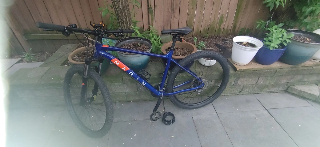 I'm selling a Marin mountain bike. The bike has disc brakes and flat pedals. Includes a combination lock for extra security. Going for a leisurely ride can be a nice way to destress after a long day.