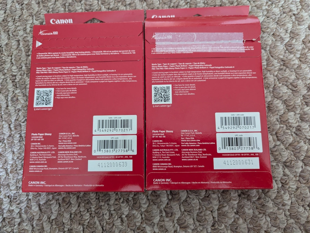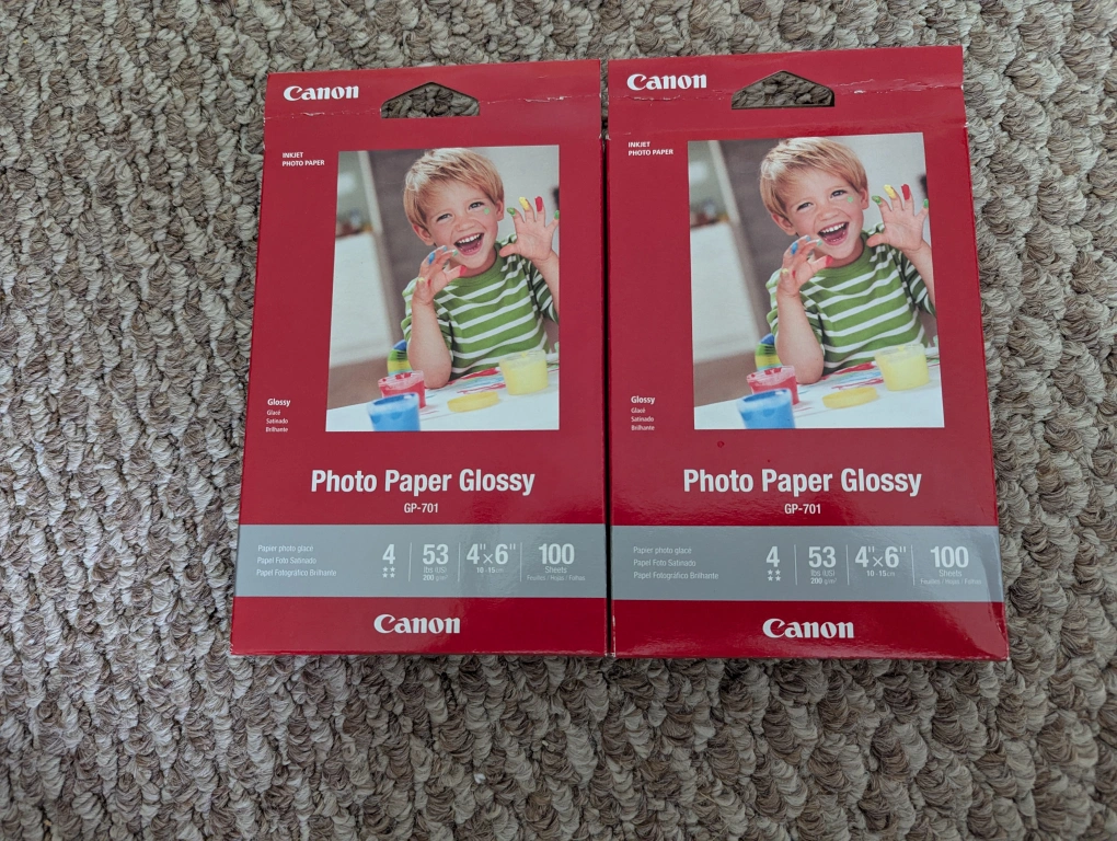 Two boxes of Canon photo paper. Each box contains 100 sheets. Great for printing your favourite photos at home to create memories for years to come.