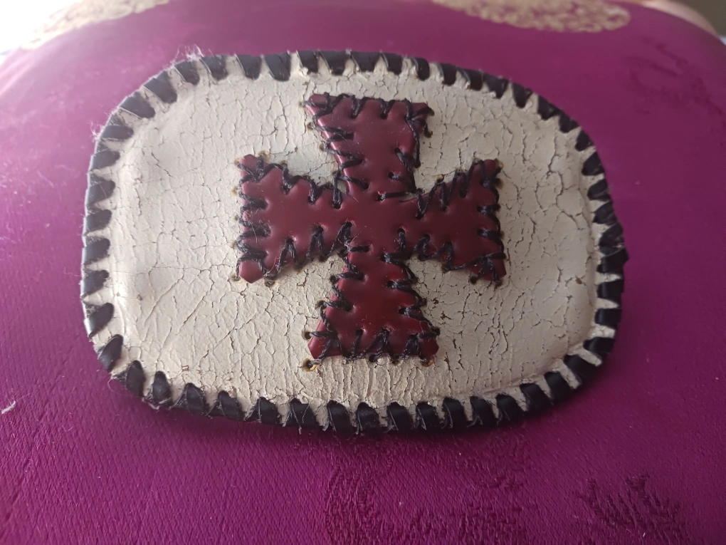 Eye-catching weathered leather belt buckle. Features a decorative stitched cross. The buckle is all leather. A unique piece for your belt that is a real conversation starter, and a great addition to any outfit. Never worn.