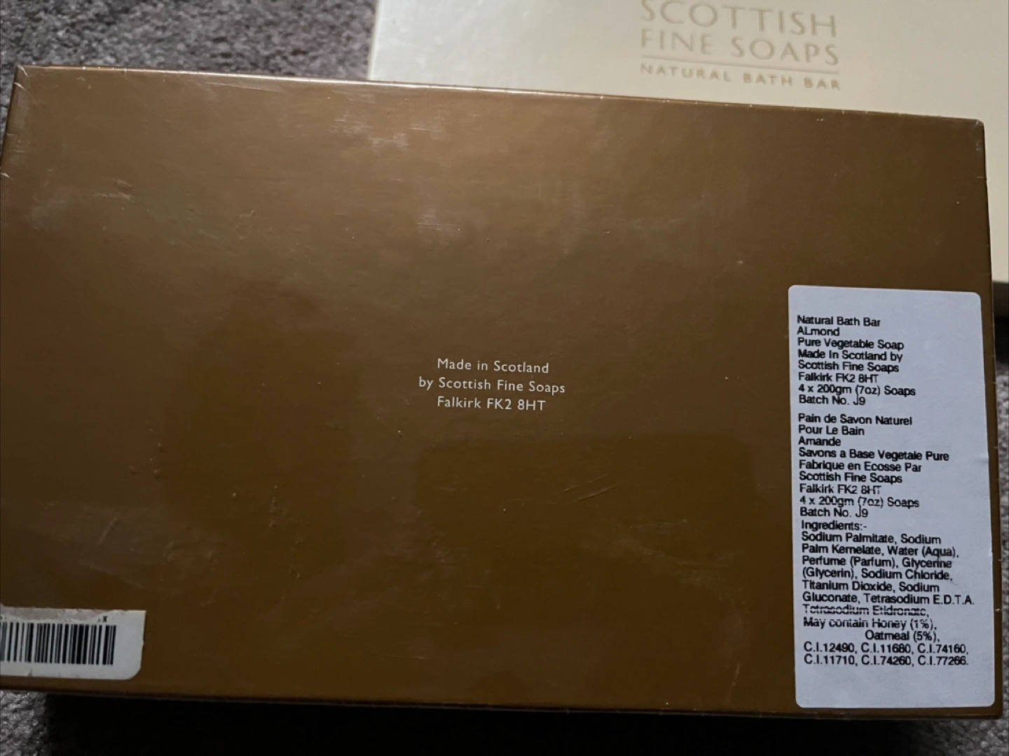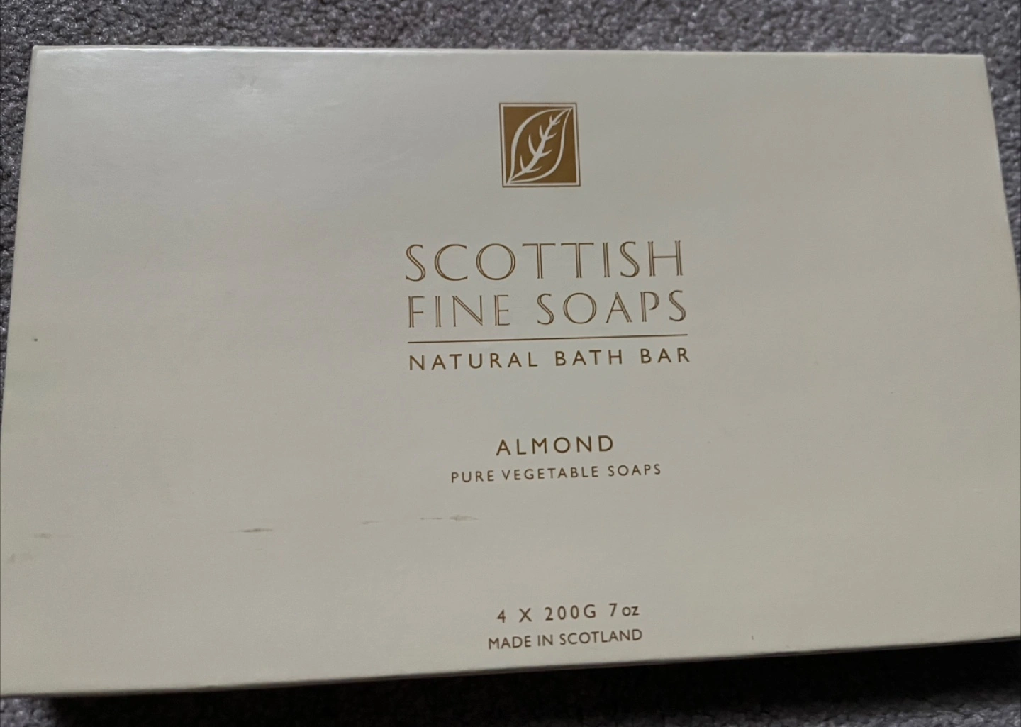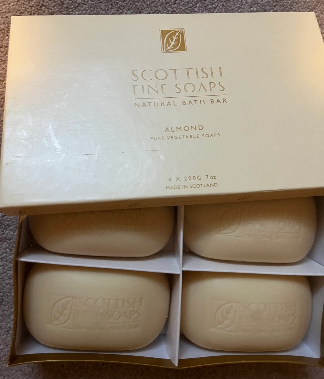 A lovely box of 4 soaps - almond bath bars -made in Scotland -in sealed packaging Great gift (Similar items selling sells online for $50- see attached photo for price comparison) No smoking and no pet household