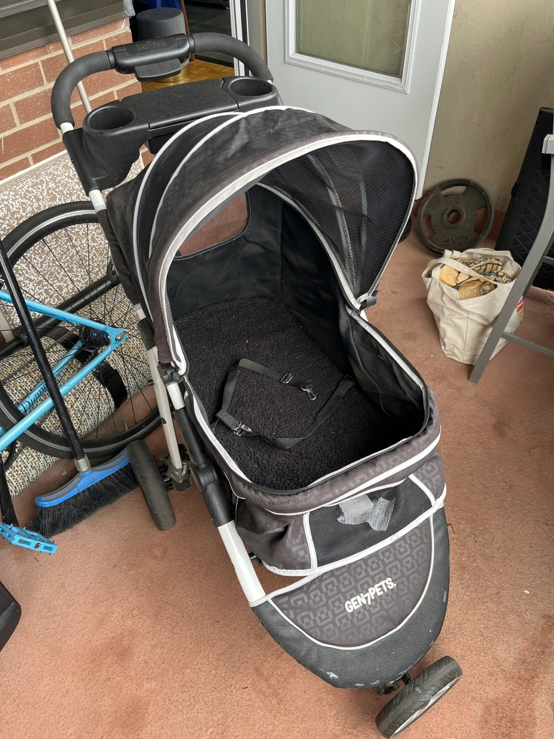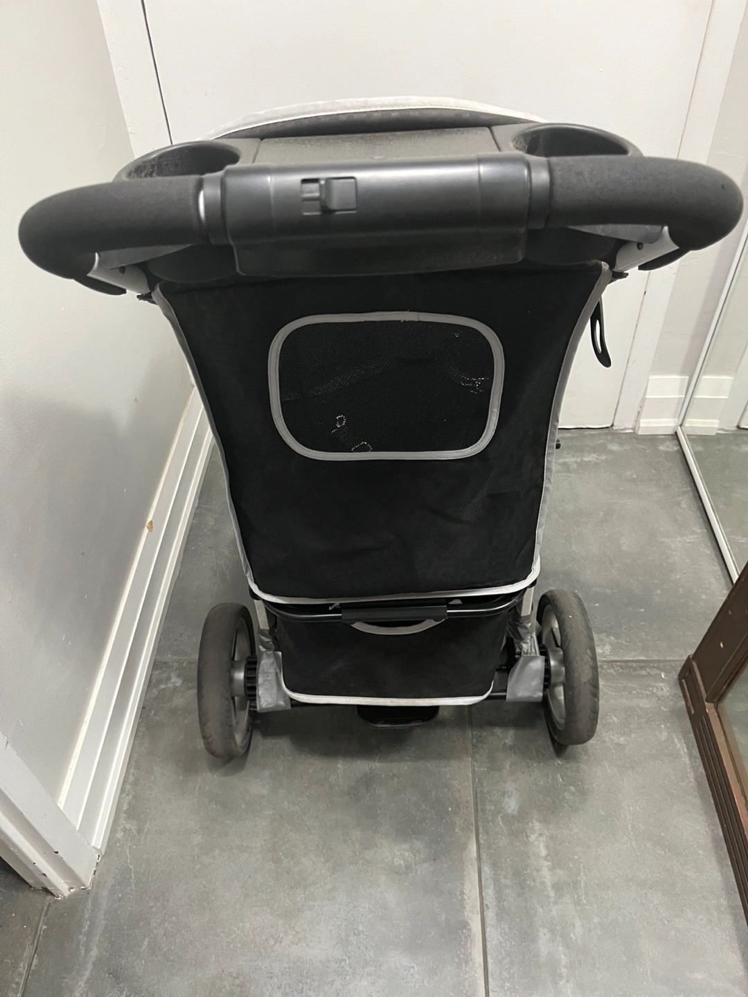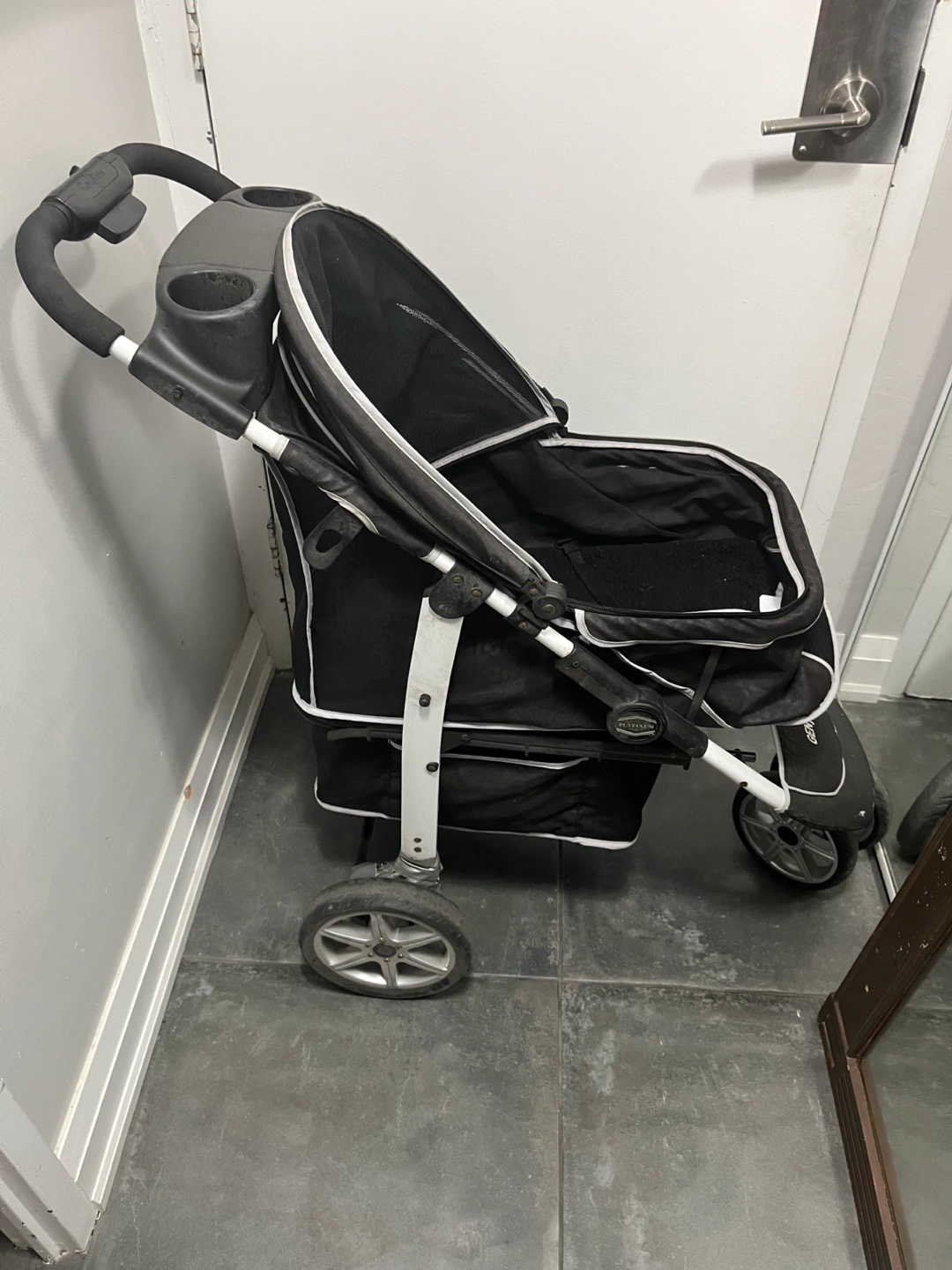 A black stroller with white trim. Features a canopy, as well as a soft interior. Designed with multiple wheels. Use this stroller for leisurely strolls with your companion. Slight issue when pulling stroller back it get stuck sometimes but otherwise perfect You can pick up by Carlton and Jarvis area