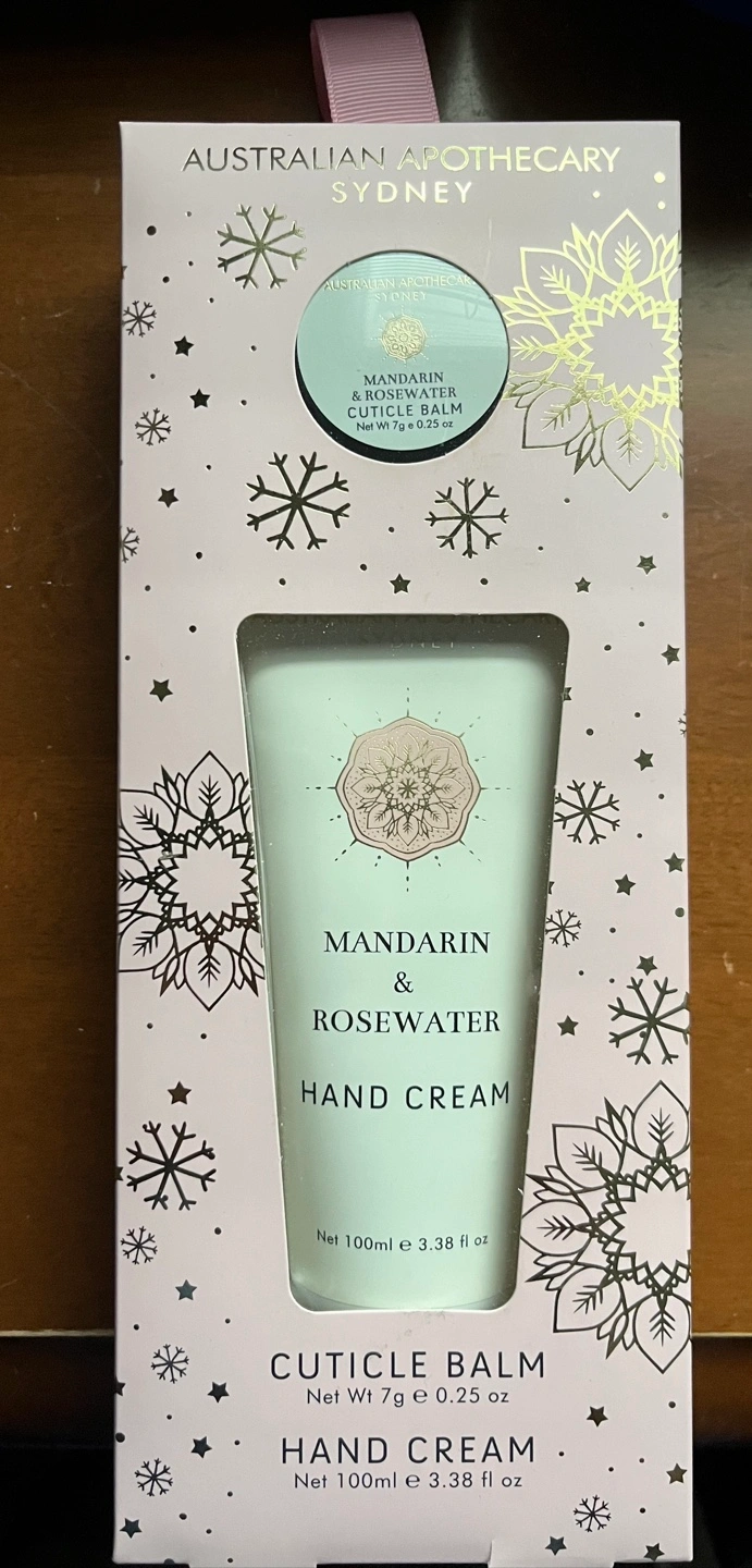 A new, unopened hand care duo. The product contains a cuticle balm and a hand cream in the scent of mandarin and rosewater. NEW sealed gift box (original price sells for over $20) No smoking and no pet household