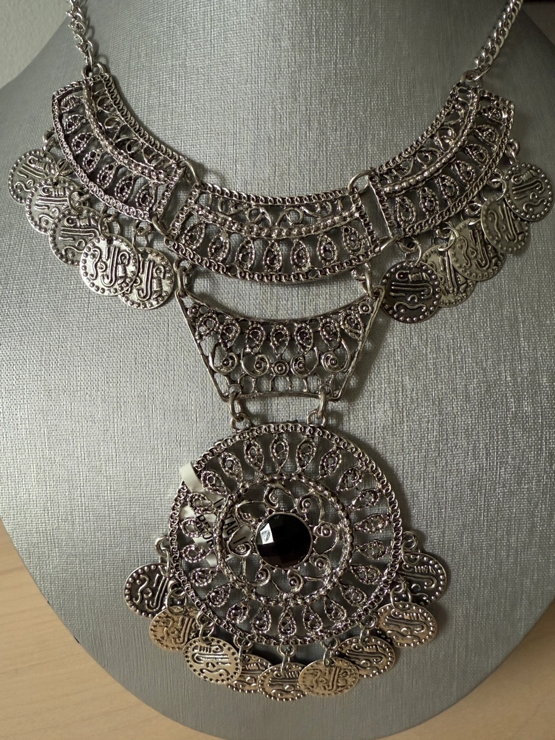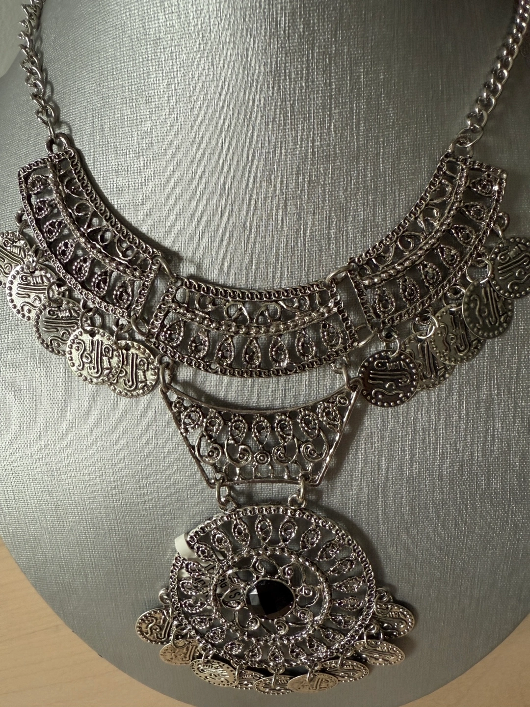 Stunning necklace, featuring an intricate design. It has multiple layers and a large, round pendant with a dark stone in the center. It would look amazing paired with a simple outfit for a touch of elegance.