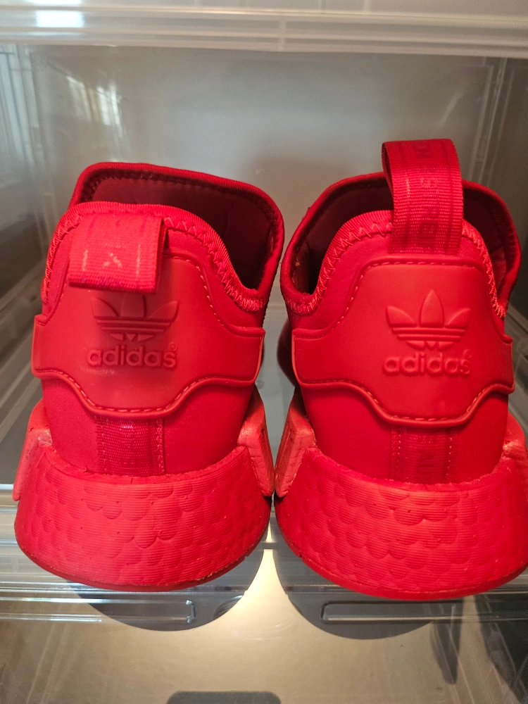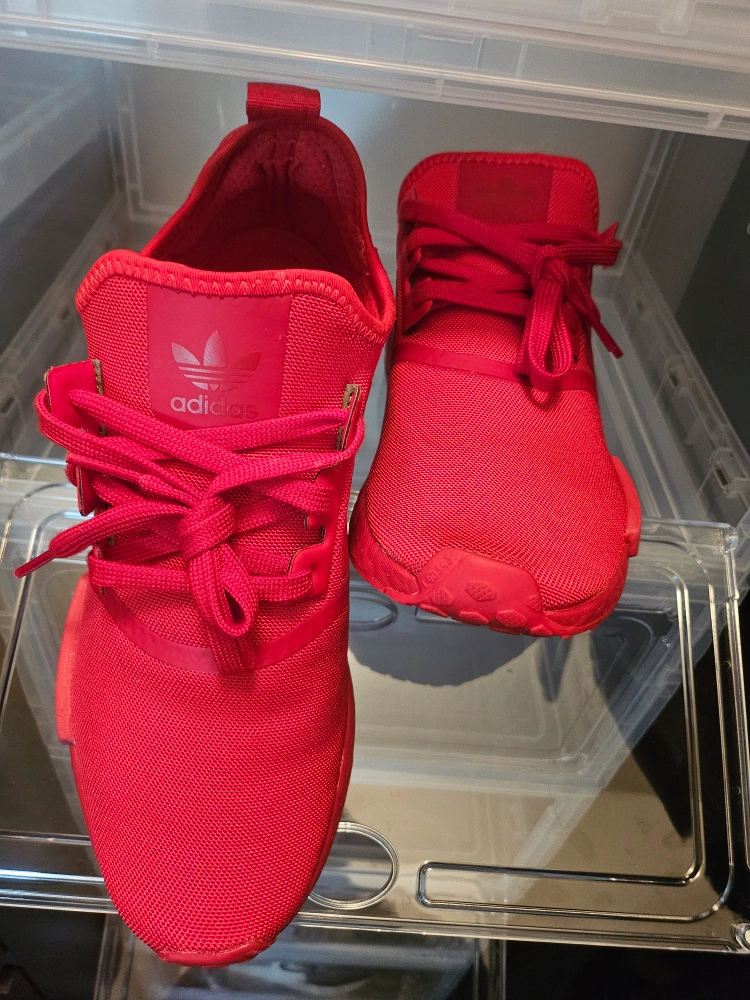 A pair of bright red sneakers. They feature the classic three stripes on the side. These sneakers will look great while out on a walk.