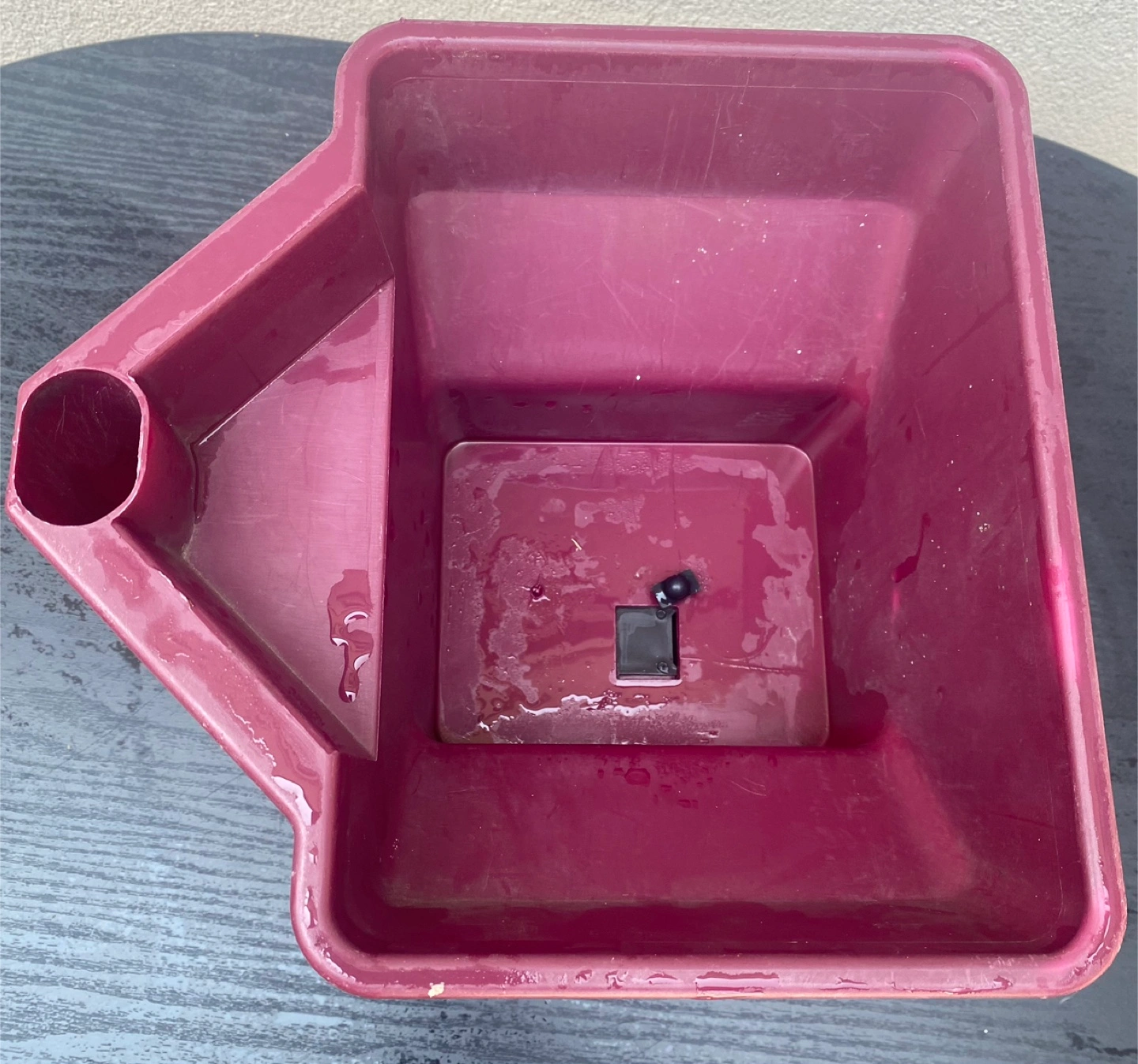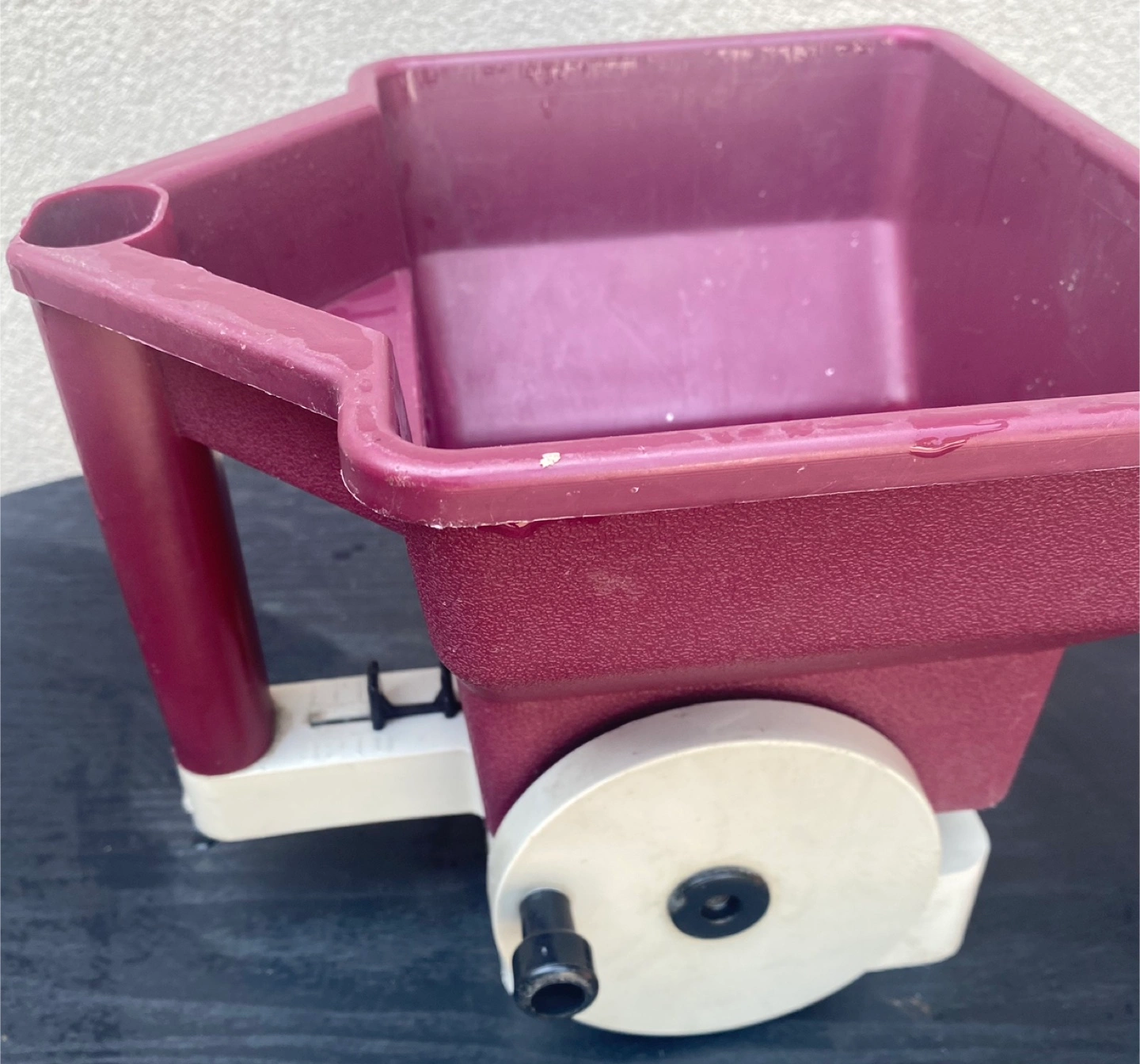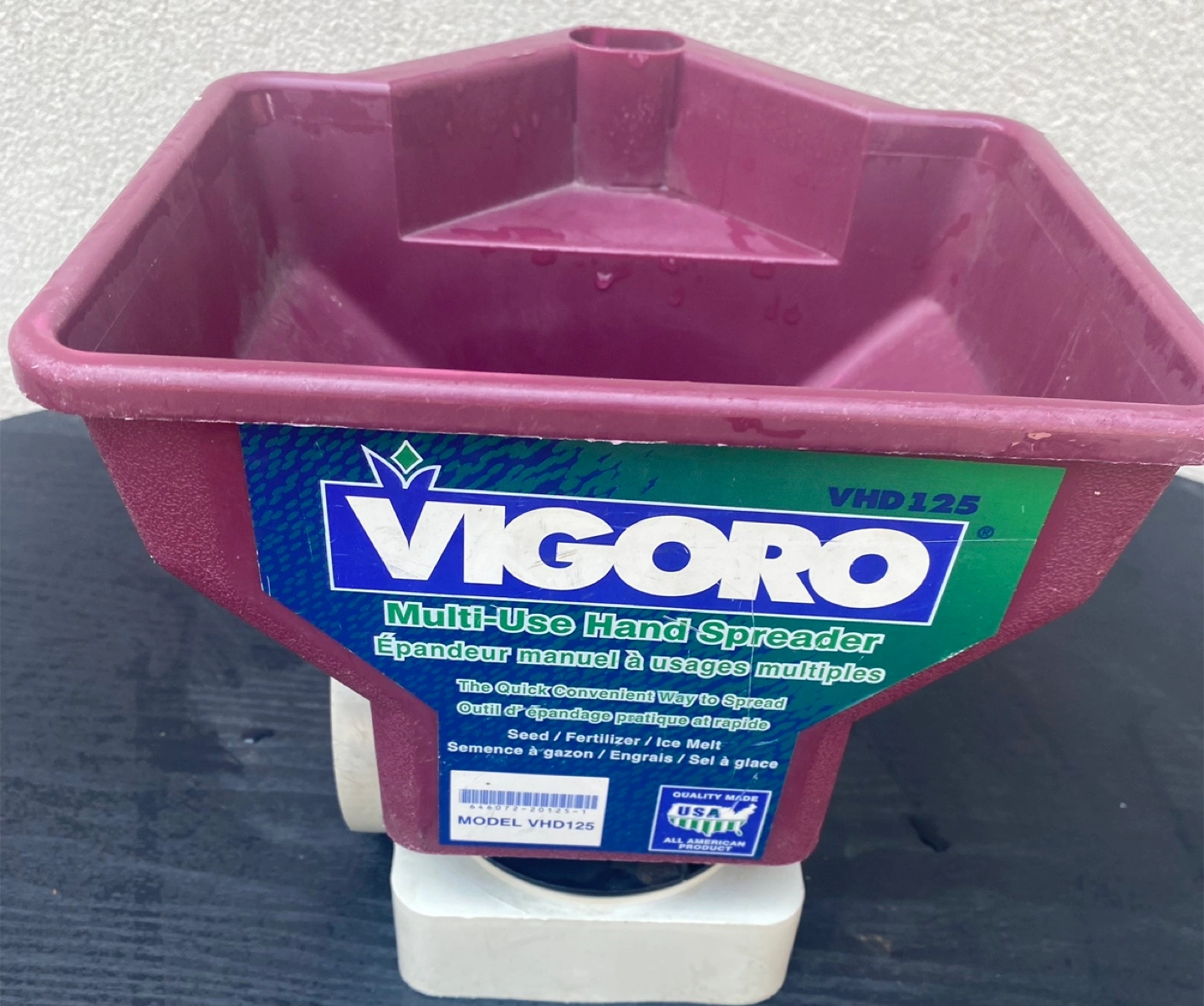 Hand spreader for seed, fertilizer, and ice melt. It features a handle and a wheel. A wonderful tool for gardening season.